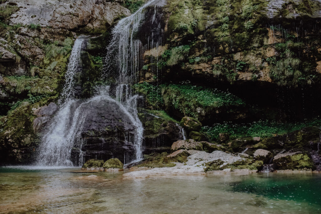 Natürlich erfreuen sich Slap Boka bei Bovec und Slap Kozjak bei Kobarid zurecht so großer Beliebtheit und ich würde mich hüten, zu beurteilen, welcher der Wasserfälle des Soca Tals der schönste sei. Was ich Dir jedoch erzählen kann ist, dass sich hinter Bovec noch ein anderer, gänzlich unbeachteter Wasserfall liegt, nicht weniger märchenhaft oder imposant als die anderen beiden. Im Gegenteil! An sonnigen Tagen schimmert das Becken des Wasserfalls Virje in allen erdenklichen Grün- und Blautönen, während stetig das Wasser in unzähligen kleinen Rinnsalen die breite, moosbedeckte Felswand hinunter tropft.