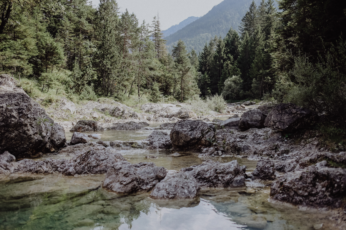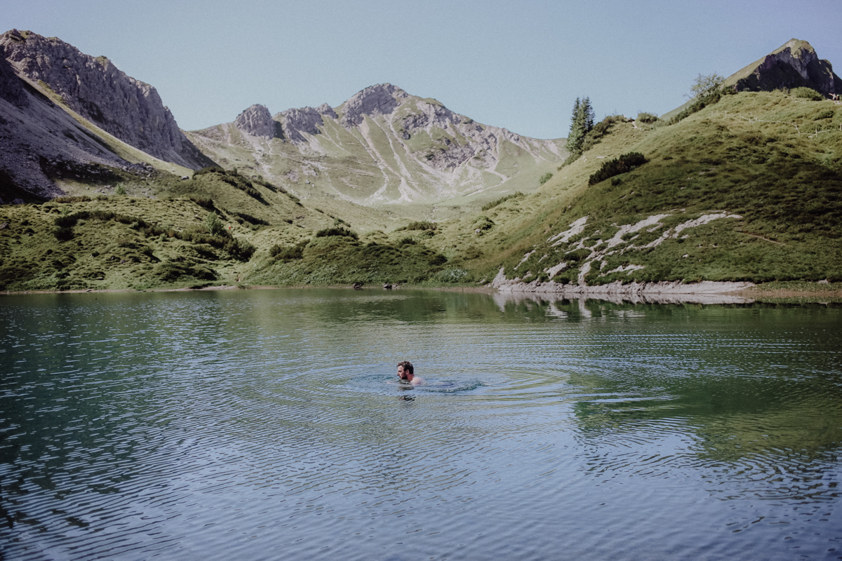 Nach dem zeitigen Frühstück machten wir uns aber auch schon an den Abstieg, um ganz früh, bevor die Tageswanderer kommen würden, ganz allein ein morgendliches Bad im Seebensee zu nehmen. 😉 Ich verspreche Dir: Das ist mindestens genauso kalt wie romantisch! Erfrischt und begleitet vom goldenen Licht der Morgensonne wanderten wir also entlang von Bächen, Wäldern, Wiesen, Kühen und Schafen zurück zur Ehrwalder Alm. Kurz zuvor kamen uns jetzt aber schon ganze Horden von Wanderern entgegen, die den sonnigen Wochenendtag in dem traumhaften schönen Bergpanorama verbringen würden.