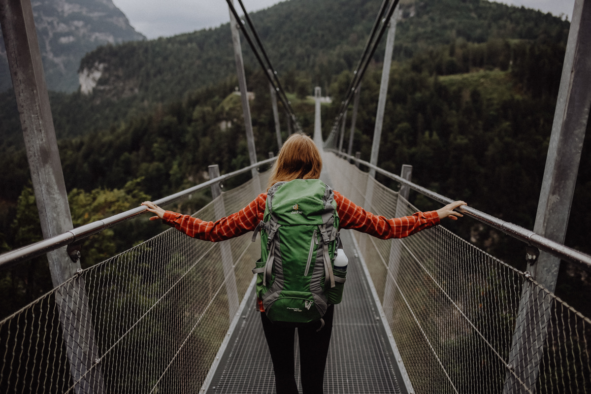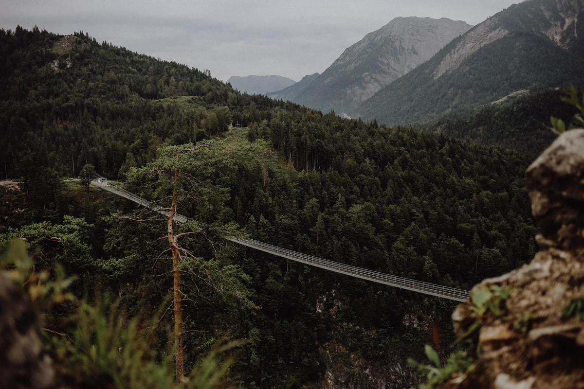 Gar nicht weit von Reutte, gerade einmal 5 Fahrminuten entfernt, spannt sich in 114 m Höhe die riesige Hängebrücke highline179 über dem Tal. Auf 406 m Länge verbindet sie die Burg Ehrwald mit dem Fort Claudia. Was von unten im ersten Moment zwar beeindruckend, aber noch gar nicht so schlimm aussieht, entpuppt sich nach der kurzen Fahrt mit der Standseilbahn zum Eingang dann aber doch als echte Mutprobe.