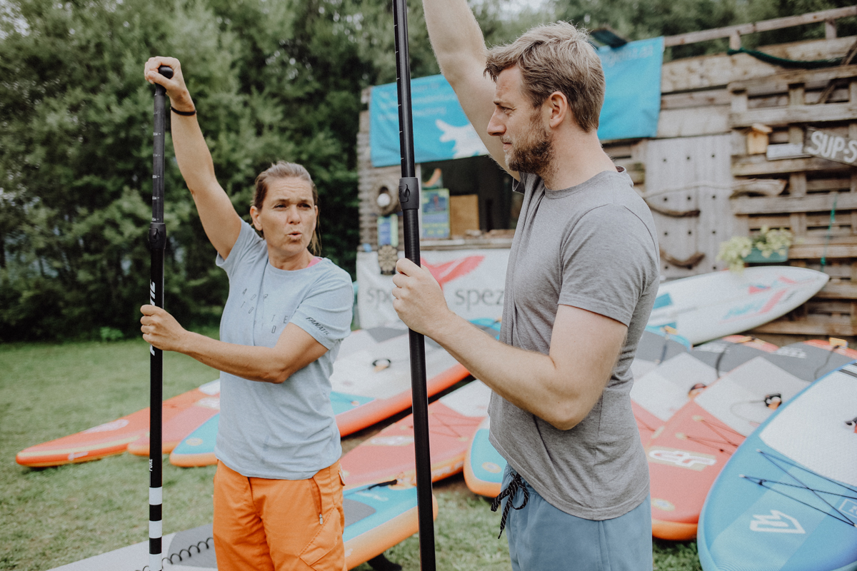 An der SUP Station begrüßten uns Carola und Bernd, ein sehr nettes Paar aus Innsbruck. Vor drei Jahren haben die beiden ihre SUP Station noch unter einem kleinen Partyzelt am See aufgebaut, inzwischen leben sie in einem supercoolen Wohn- und Bürocontainer samt Sonnenterrasse und verbringen die Sommermonate so mitten in der Natur und nur einen Katzensprung vom Wasser entfernt.