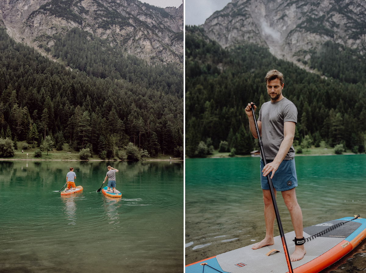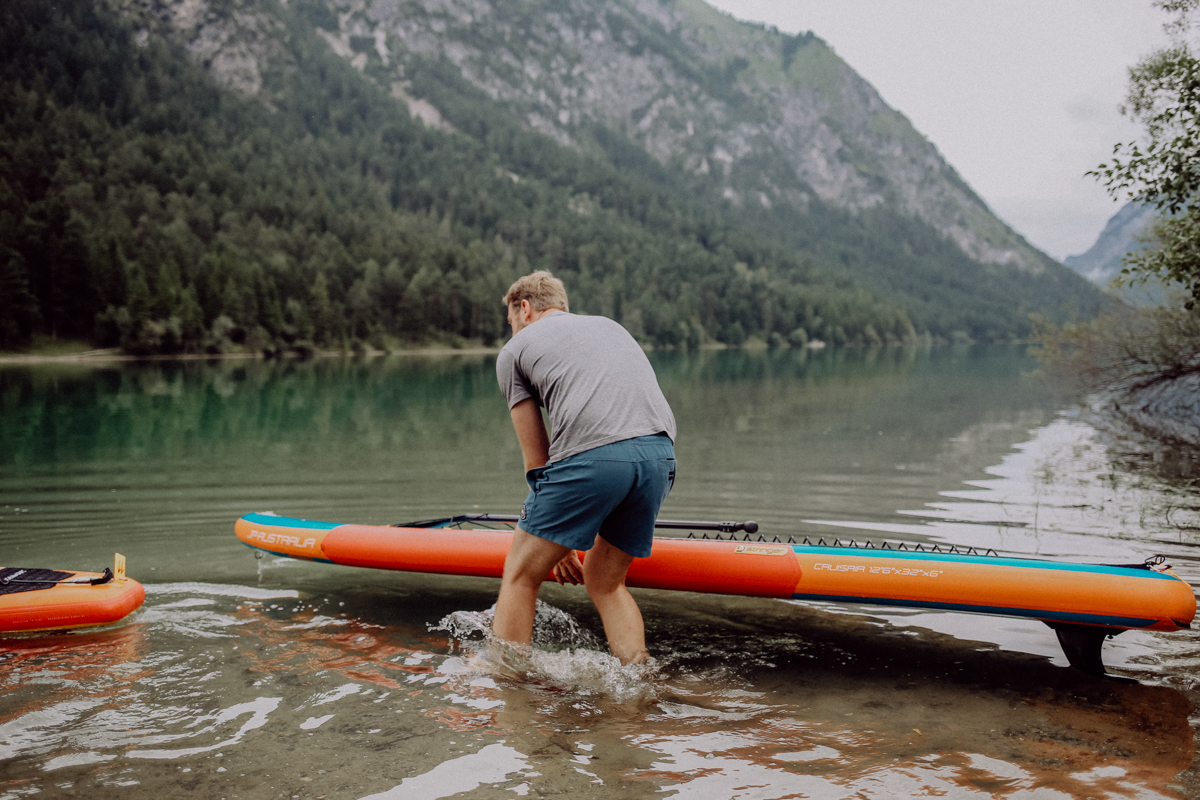 Wer noch keine SUP Erfahrung hat oder lieber gemeinsam unterwegs ist, kann bei den beiden auch Kurse oder Touren buchen. Auf diese Weise half Carola auch Michael, der an diesem Tag zum ersten Mal auf dem Brett stand. Allerdings dauerte es auch keine zwei Minuten, bis er sich aus dem Kniestand auf die Füße traute und im Wasser rumpaddelte, als hätte er das schon viel öfter gemacht. Neben stabilen Boards für Anfänger haben die beiden aber auch Raceboards im Repertoire, sodass man bei Lust und Laune ganze Touren bis auf den Plansee unternehmen kann. Wenn wir das nächste Mal zurückkommen, wollen wir es auf jeden Fall mit einer Nachttour versuchen, wenn die Sterne den Himmel erleuchten und die LED das Wasser… die Bilder und Beschreibungen waren einfach magic!