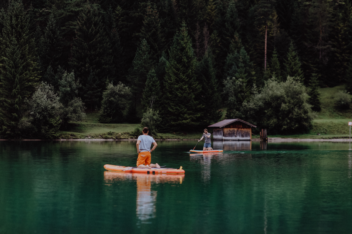 Zurück auf festem Boden – es war gerade mal halb zehn – machten wir auf dem Weg zur Ehrwalder Almbahn, die uns später in Richtung Coburger Hütte bringen sollte, einen weiteren Stop am Heiterwanger See. Schließlich war es noch früh und es blieben uns noch ein paar Stunden, bis wir die Wanderschuhe schnüren würden. Auf diesen Ausflug haben wir uns ganz besonders gefreut, denn hier am Heiterwanger See, gibt es die Möglichkeit SUP auszuleihen und auf dem See vor schönstem Bergpanorama herumzupaddeln.