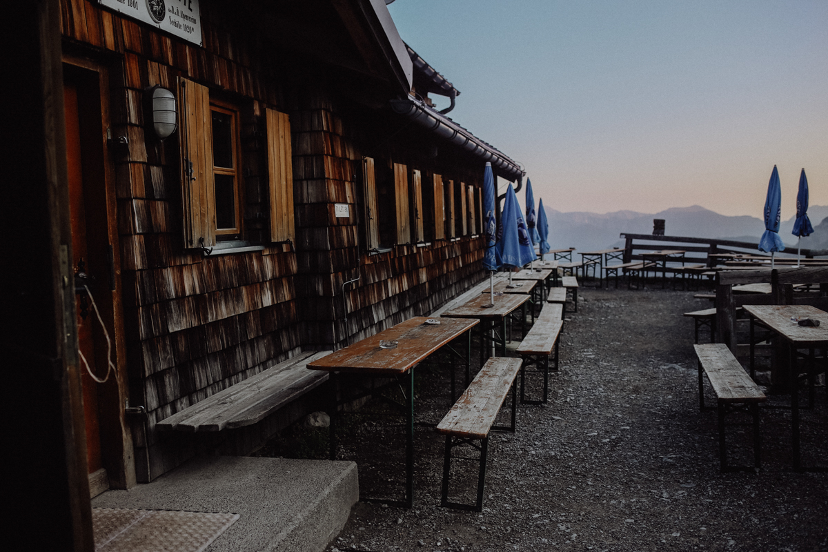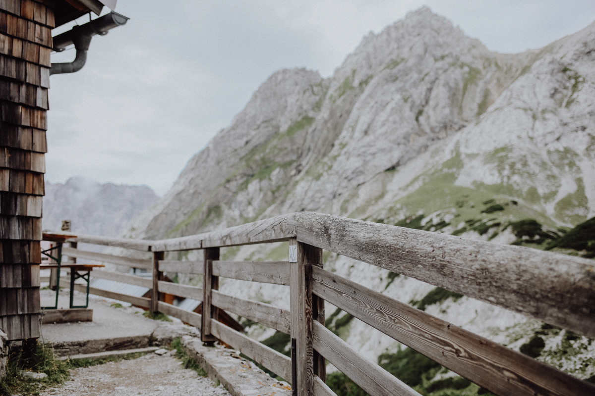 Nach gefühlt eintausend Fotos und nachdem wir uns noch mehrfach zum See mit der Zugspitze im Hintergrund umgedreht hatten, nahmen wir dann den letzten steilen Anstieg zur Hütte. Und yes, ein bisschen stolz bin ich ja schon immer, wenn ich schneller bin, als es die Schilder es ausweisen. In unter 30 Minuten kraxelten wir durchs Geröll und obwohl die Wanderung vergleichsweise noch recht einfach war, war das Gefühl, als ich hinter der letzten Kurve endlich die Hütte erblickte doch dasselbe wie immer: Ein wunderbares, erleichtertes Kribbeln mit großer Lust nach Radler und Kuchen, ganz so, wie sich Bilbo und die Zwerge wohl fühlten, als Beorn nach ihrem langen Weg den Tisch mit Brot, Butter und Honig deckte.