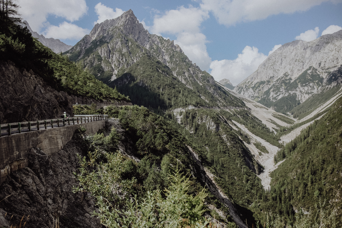 Auf knapp 25 Kilometern führte uns der Pass von Imst über viele enge Kurven vorbei an schroffen Felswänden, einer tiefen Schlucht und herrlich grünen Bergwiesen ins Tannheimer Tal – natürlich nicht ohne ein wirklich atemberaubend schönes Panorama nach dem Scheitelpunkt auf knapp 1900 m Höhe.