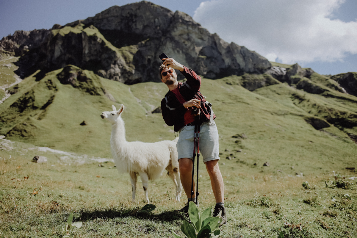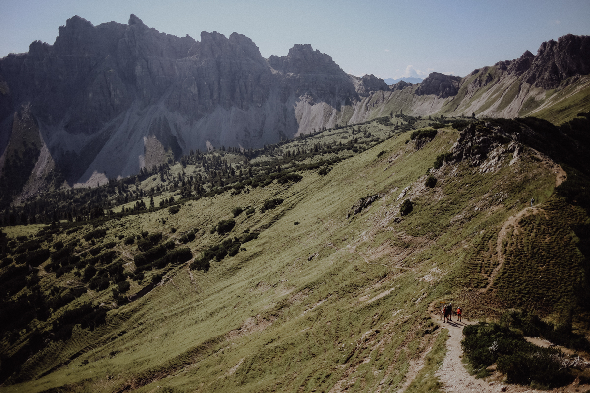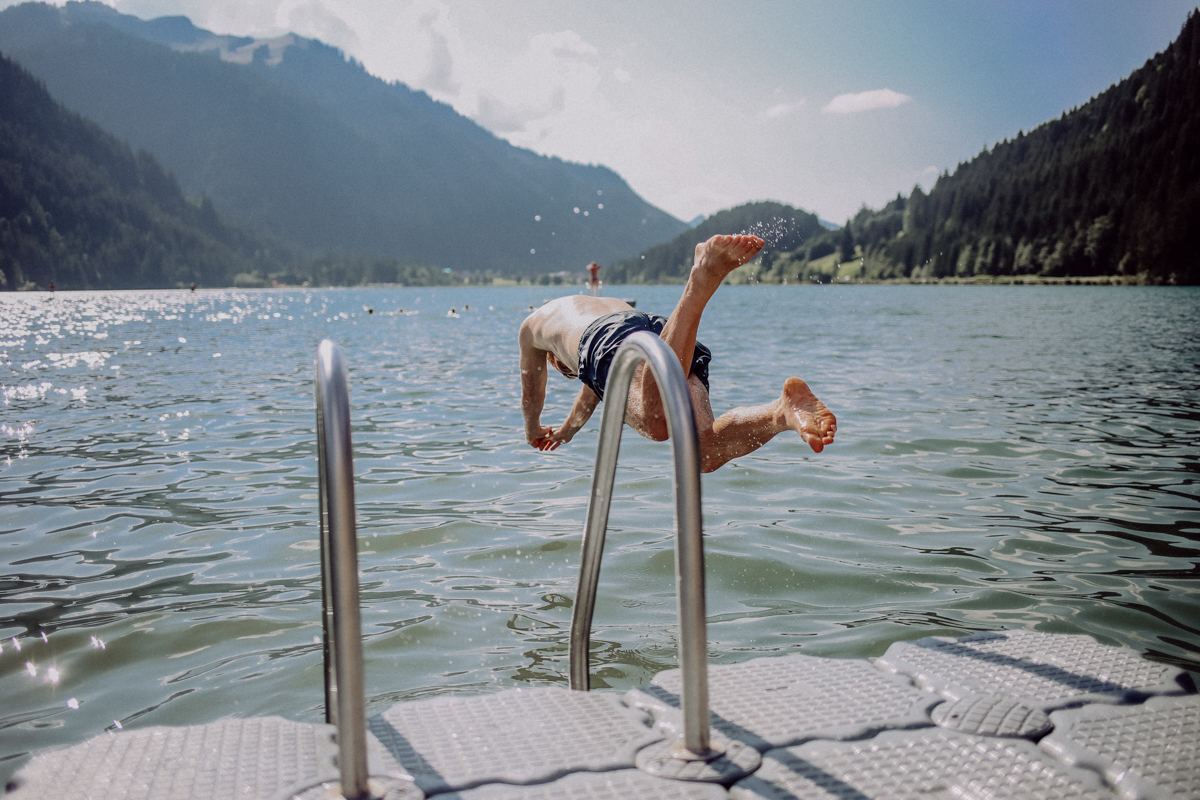 Weil all unser Glück bis hierhin noch nicht genug war, weckte uns früh die Sonne vor einem strahlend blauen Himmel ohne jedes Wetterwölkchen. Nach einem Frühstück (das übrigens mindestens genauso gut wie das Abendessen war), konnten wir es also kaum erwarten, mit der Neunerköpflebahn auf den Berg zu fahren. An der Bergstation unterhalb des gleichnamigen Gipfels starteten wir dann zur Drei-Seen-Wanderung über den Saalfelder Höhenweg zur Lache an der Landsberger Hütte, hinunter zum Traualpsee und zurück ins Tal zum Vilsalpsee. Dabei führte uns der Weg entlang des Berggrats durch saftig grüne Wiesen, vorbei an unzähligen Kühen, bis hinauf zur Schochenspitze. Dort, am höchsten Punkt der Wanderung, eröffnete sich dann ein traumhafter Blick hinunter auf die blau schimmernden Seen in denen es sich (Du kennst uns ja inzwischen) natürlich auch wunderbar in der Mittagssonne baden lässt.