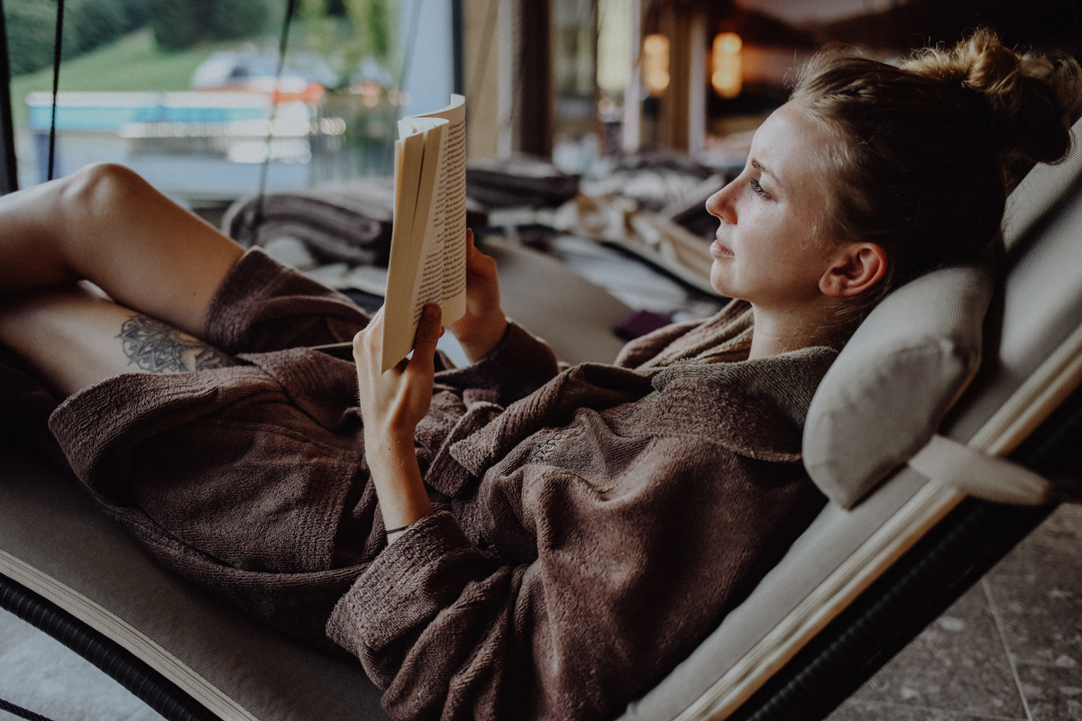 Erst, als unser Vitamin D Speicher wieder voll und die Mozartkugeln alle waren, nahmen wir die letzten Kilometer zum Biohotel Bergzeit in Zöblen. Und man, ich sag dir, als wir ankamen waren wir uns gar nicht mehr so sicher, ob wir den Nachmittag nicht lieber dort verbracht hätten. Immerhin wartete hier das wohl mit Abstand gemütlichste Hotelzimmer, in dem ich bisher je übernachtet habe und ein superschnieker Wellnessbereich mit Saunen und Ruheraum samt Bergblick. Und obwohl ich mich in Hotels normalerweise eher fremd und fast ein bisschen unbehaglich fühle, verspürte ich hier ab der ersten Minute ein ganz warmes Zuhause-Gefühl (was vielleicht auch dadurch verstärkt wurde, dass im Bücherregal in der Lobby ein Harry Potter Band stand ;)).