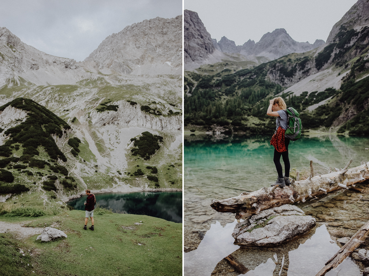 So schön und aufregend die SUP Tour und der Besuch der highline179 auch waren, so sehr zog es uns jetzt auch in Richtung Berg. Ich konnte es kaum erwarten, endlich in die Bahn zu steigen und die erste Kaspressknödelsuppe zu essen! Gegen Mittag packten wir an der Talstation der Ehrwalder Almbahn also unseren Rucksack und schummelten uns auf diese Weise auf die gleichnamige Alm. Nach einem stärkenden Mittagessen an der Hütte der Bergstation begannen wir dann endlich den langersehnten Aufstieg zur Coburger Hütte. Nach einem ersten kurzen Stück entlang der Forststraße und vorbei an Kühen, führte der Weg dann auch wie im Bilderbuch auf einem schmalen Pfad durch den Wald bis wir nach etwa eineinhalb Stunden erst die Seebenalm und wenige Minuten später auch den spektakulär schönen Seebensee erreichten. Spätestens hier braucht es dann eine ausgedehnte Pause, weil man das See- und Bergpanorama gar nicht mehr hergeben will.