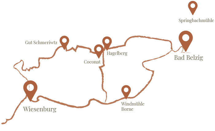 Ganz in der Nähe der Nieplitz-Quelle und nur 3 Kilometer außerhalb von Bad Belzig liegt wie in einem Bilderbuch die Springbachmühle mit ihrer riesigen Sonnenterrasse. Wie eh und je plätschert das Wasser am Mühlrad vor dem großen Fachwerkhaus vor sich hin und fließt in den kleinen Teich gleich neben dem Restaurant. Auf der Karte stehen wirklich fein zubereitete deutsche Klassiker wie Forelle oder Rindergulasch, aber auch einige raffinierte vegetarische Gerichte.