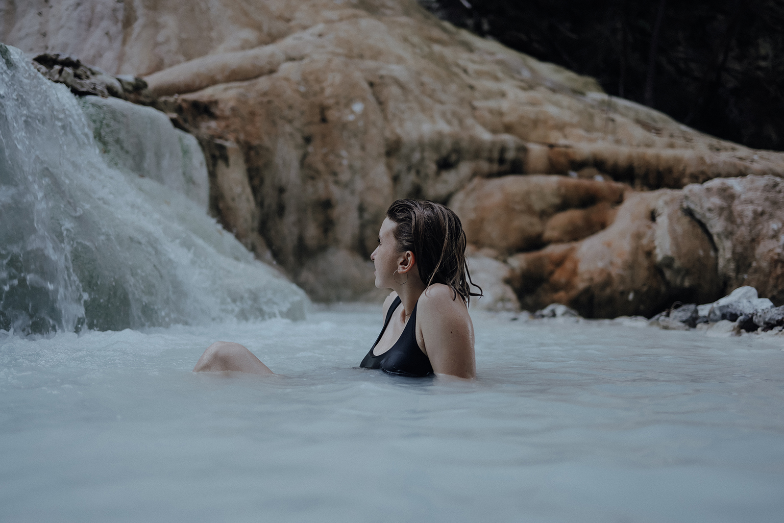 Die Landschaft, die sich hier zwischen den Bäumen versteckt ist absolut einzigartig: Rote Waldböden grenzen an milchig-weiße oder hellblau schimmernde Wasserbecken, im Hintergrund der riesige strahlend weiße Kalksinterabhang mit seinen vielen Wasserfällen. Dabei gilt: Je weiter oben Du badest, desto heißer ist das Wasser. Was sofort auffällt, ist die andächtige Ruhe an diesem magischen Ort. Die BesucherInnen respektieren einander und jeder sucht sich entlang des Bachs seine eigene Badewanne oder den privaten Wasserfall.