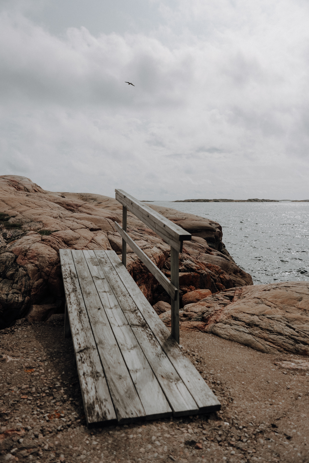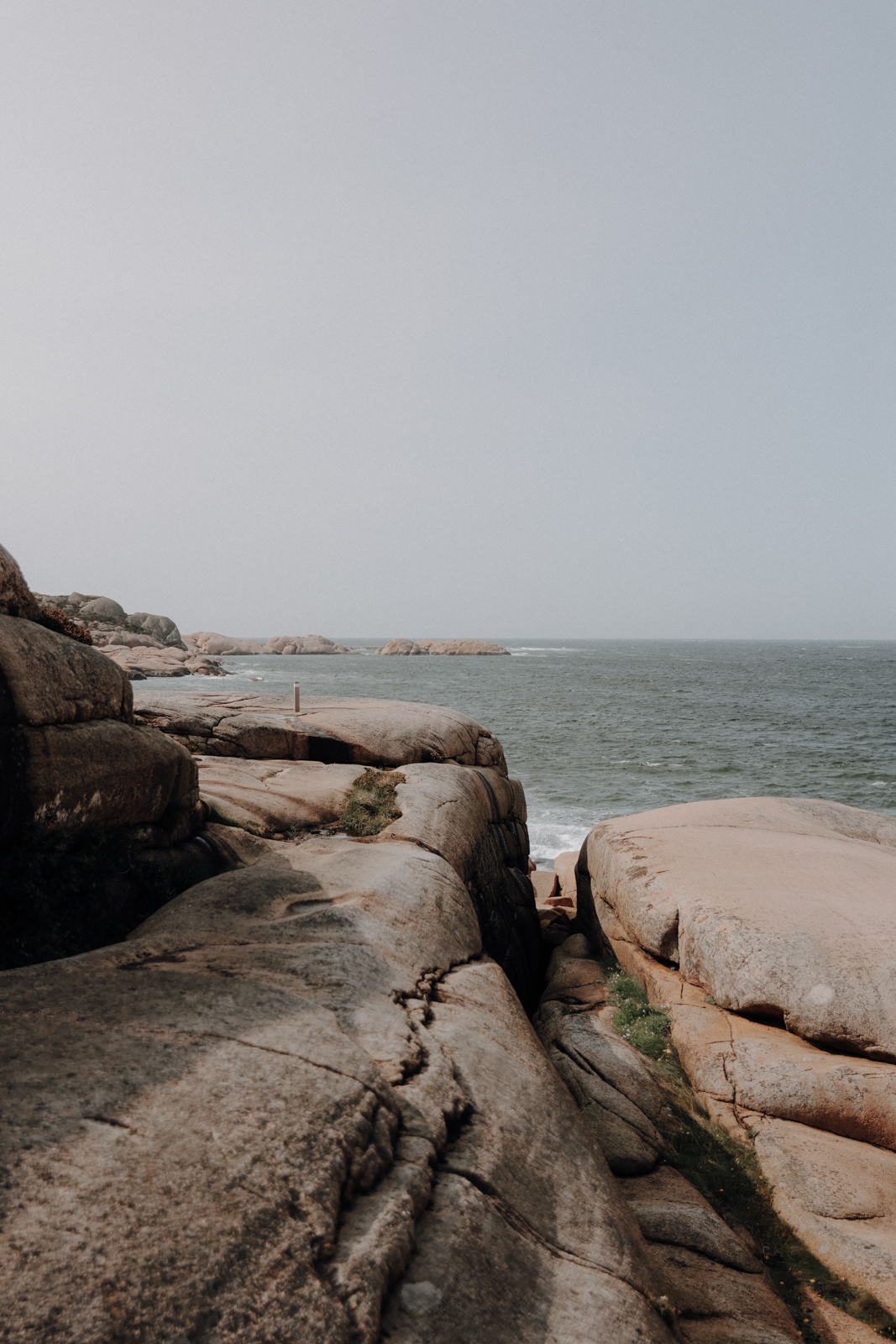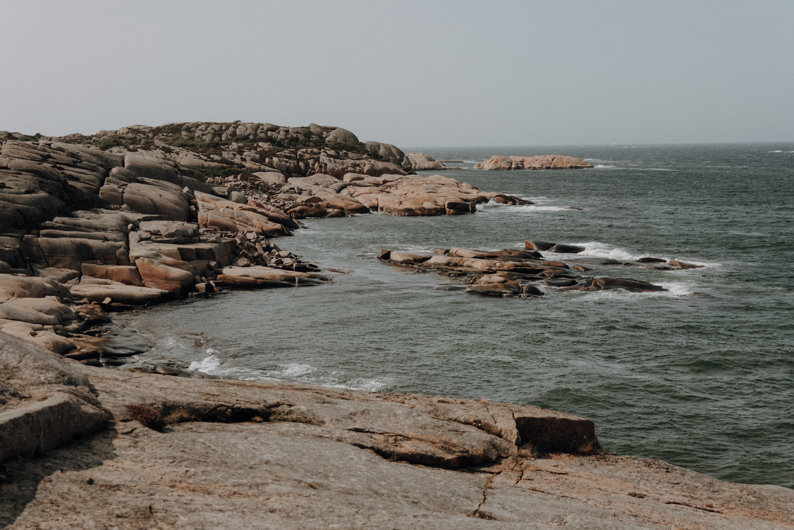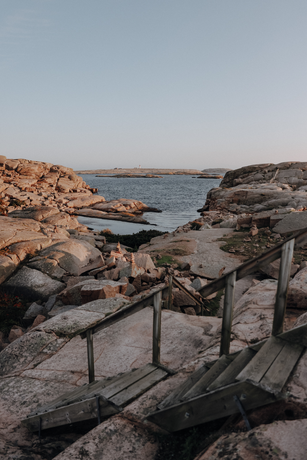 Ganz anders als an den anderen beschriebenen Orten in Bohuslän, sind die Felsen hier so riesig, dass man sich schon an die Markierungen des Kuststigen halten muss, um nicht an einer unüberwindbaren Schlucht oder Felswand zu enden, was die ganze Wanderung nur umso abenteuerlicher macht! Überall kraxelt man über kleine Leitern und Holzbrücken hinauf und hinab, findet hinter jeder Biegung neue spektakuläre Aussichten, nur um sich gleich wieder vom Wind wegpusten zu lassen.