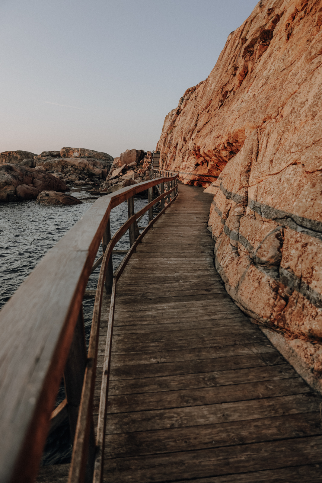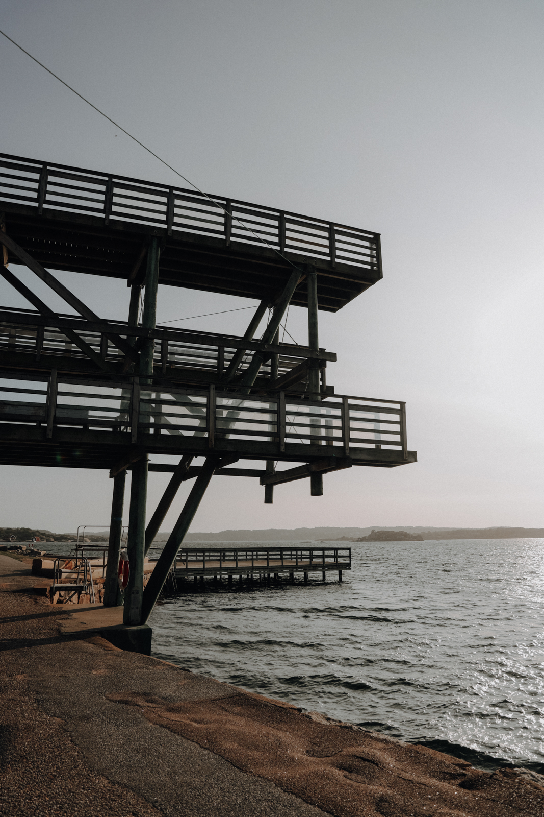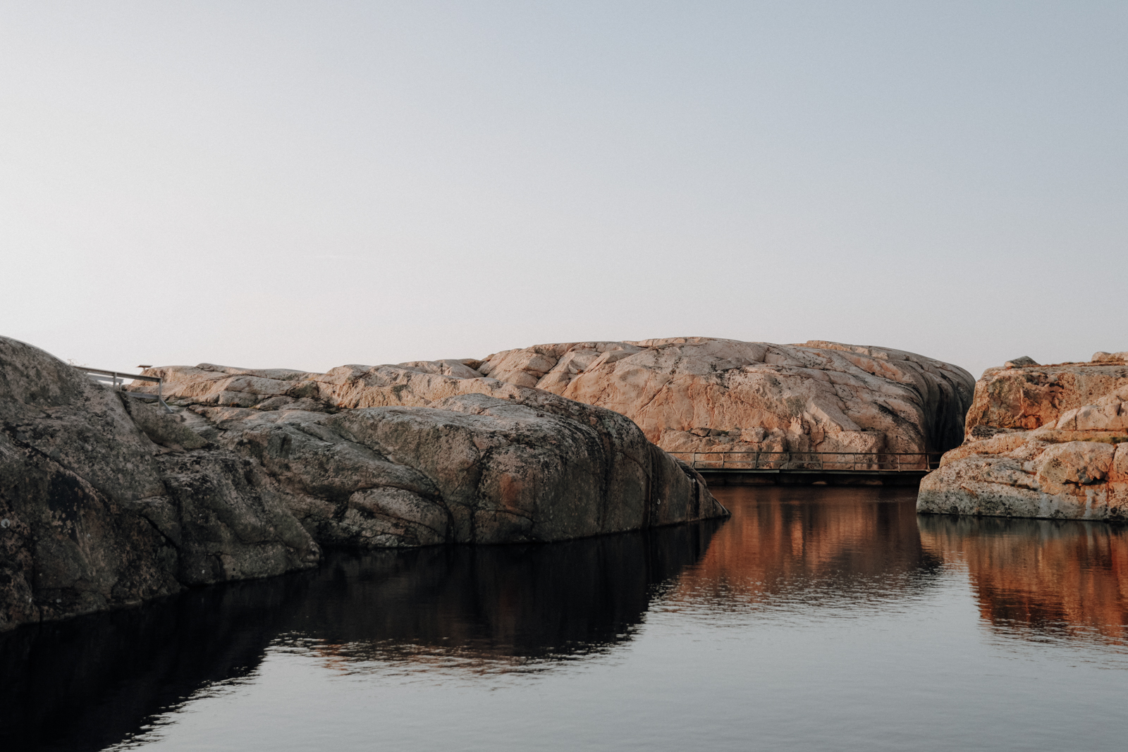 Eigentlich wollte ich nur nach Hunnebostrand, weil sich dort einer der höchsten Sprungtürme (12 Meter!) befindet, den ich in Bohuslän finden konnte. Als wir ankamen, musste ich jedoch feststellen, dass nicht nur der Sprungturm außergewöhnlich ist, sondern der ganze Ort. Glücklicherweise war bis zum Sonnenuntergang noch genug Zeit, um in aller Ruhe zunächst an der Promenade entlang und später über die Holzstege des vorgelagerten Yachthafens zu schlendern. Während man von der Promenade immerzu auf die Schären schaut, wandelt man am Gasthafen zwischen Felsen und umgeben von unzähligen roten Holzhäuschen, Segelbooten, Holzbrücken und Fischernetzen, deren Silhouetten sich vor der untergehenden Sonne abzeichnen. Und tatsächlich hat sich hier einmal mehr bewahrheitet, dass es oftmals die ungeplanten, kleinen Überraschungen auf Reisen sind, die einem am meisten in Erinnerung bleiben…