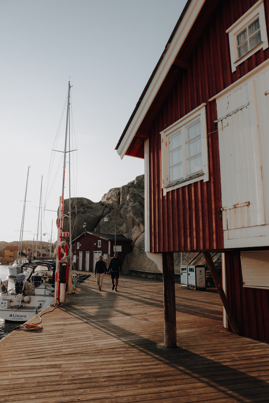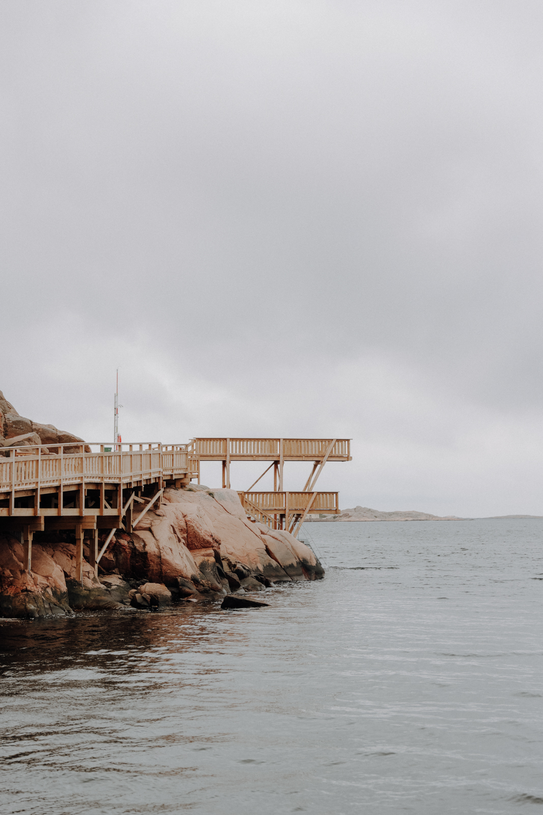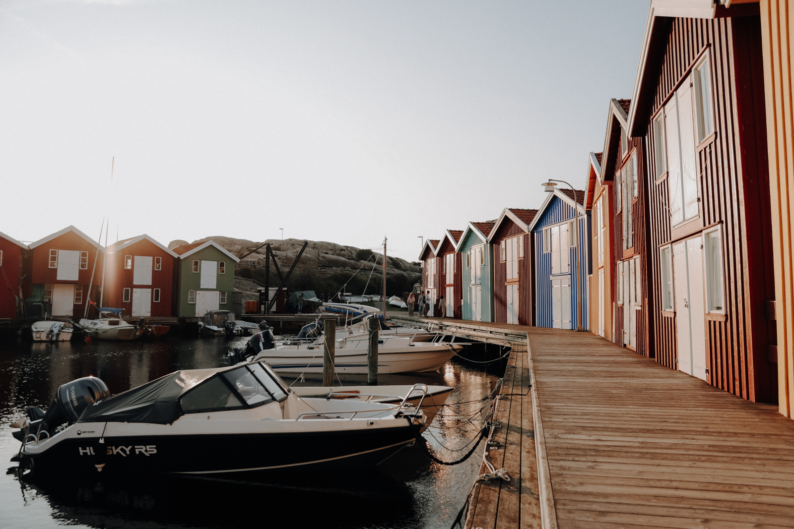 Eigentlich wollte ich nur nach Hunnebostrand, weil sich dort einer der höchsten Sprungtürme (12 Meter!) befindet, den ich in Bohuslän finden konnte. Als wir ankamen, musste ich jedoch feststellen, dass nicht nur der Sprungturm außergewöhnlich ist, sondern der ganze Ort. Glücklicherweise war bis zum Sonnenuntergang noch genug Zeit, um in aller Ruhe zunächst an der Promenade entlang und später über die Holzstege des vorgelagerten Yachthafens zu schlendern. Während man von der Promenade immerzu auf die Schären schaut, wandelt man am Gasthafen zwischen Felsen und umgeben von unzähligen roten Holzhäuschen, Segelbooten, Holzbrücken und Fischernetzen, deren Silhouetten sich vor der untergehenden Sonne abzeichnen. Und tatsächlich hat sich hier einmal mehr bewahrheitet, dass es oftmals die ungeplanten, kleinen Überraschungen auf Reisen sind, die einem am meisten in Erinnerung bleiben…