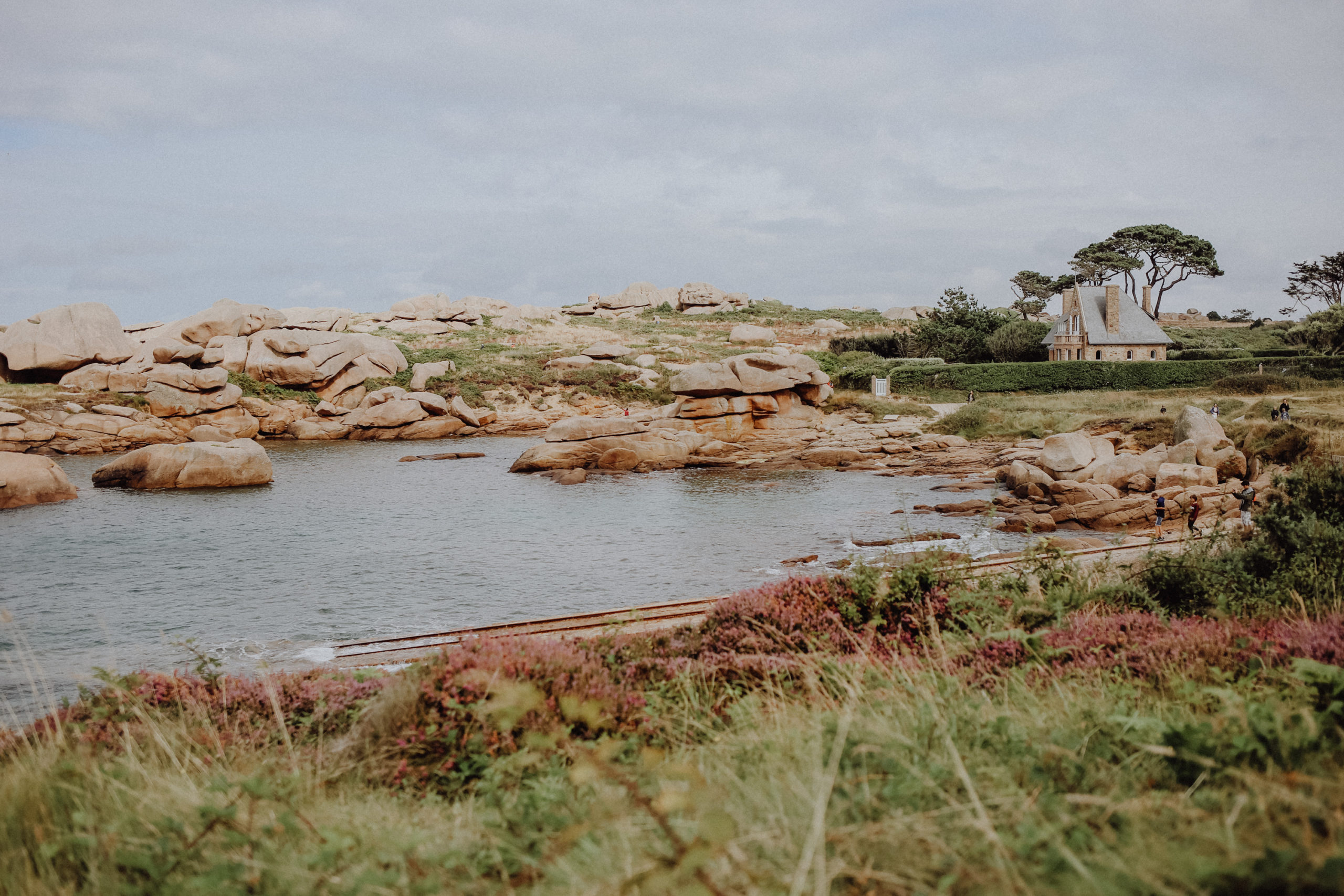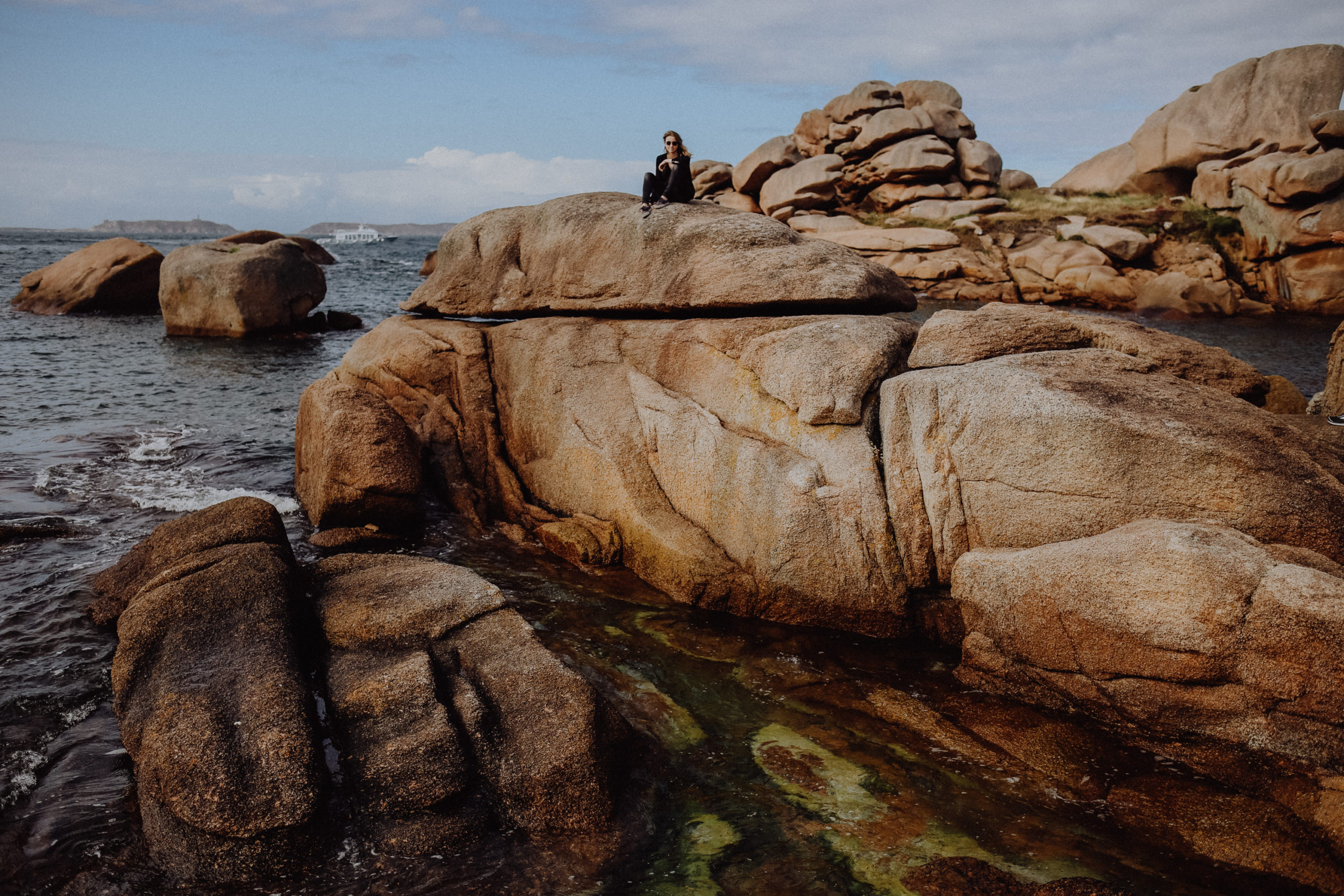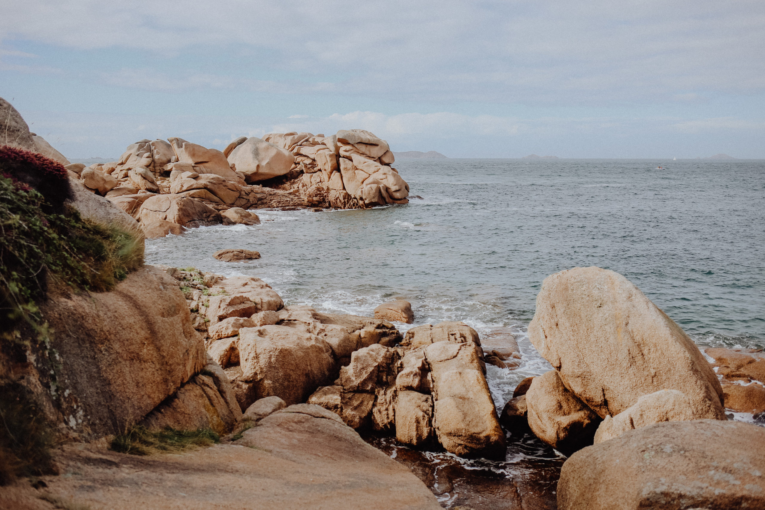 Unser nächstes Ziel ist der Ort Ploumanac’h im Herzen der rosafarbenen Granitküste. Der Name ist Programm: Der Küstenabschnitt besteht aus riesigen rosafarbenen Granitfelsen, die einen farbenfrohen Kontrast zum tiefblau glitzernden Wasser des Atlantiks bilden. Von hier kann man auf dem Zöllnerpfad (Sentier des Douaniers/GR 34) auf etwa 6 Kilometern Länge bis nach Perros Guirec wandern. Dieser Abschnitt gilt als der schönste des Wanderwegs in der Bretagne und führt an unzähligen Felsformationen entlang des Meeres vorbei mit ständigem Blick auf die vorgelagerten Sept-Iles. Da es uns ehrlich gesagt zu kompliziert war, nach einem Bus zu suchen, sind wir die Strecke einmal hin und durch die Ortschaften wieder zurück gelaufen. Zumindest vormittags fährt hier allerdings zwischen 9.00 und 12.30 auch der “Puffin Shuttle”, der einen ggf. auch wieder zurück bringen würde.