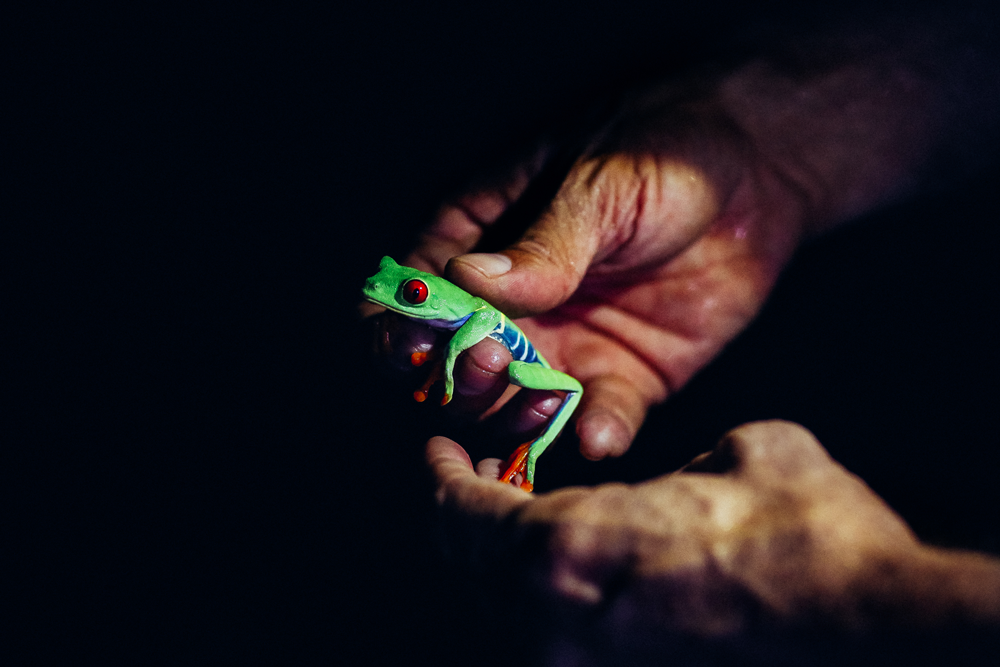 Ausgestattet mit Gummistiefeln, langer Hose und Regenjacke machten wir uns also auf die Suche nach allen Tieren, die man ja normalerweise gar nicht sehen möchte. Neben einer kleinen Schlange, Kröten, Grashüpfern und Spinnen samt Baby-Tarantel, fanden wir tatsächlich einen Red Eyed Tree Frog – das Wahrzeichen Costa Ricas. Dieser Fund war anscheinend so besonders, dass sogar unser Guide völlig aus dem Häuschen war… Rote Augen, ein giftgrüner Körper, der blau-gelb gestreifte Bauch und orange Füße. Dieser Frosch ist mit Abstand das verrückteste, schönste Tier, das ich in Costa Rica zu Gesicht bekommen habe.