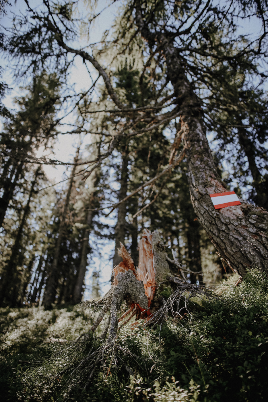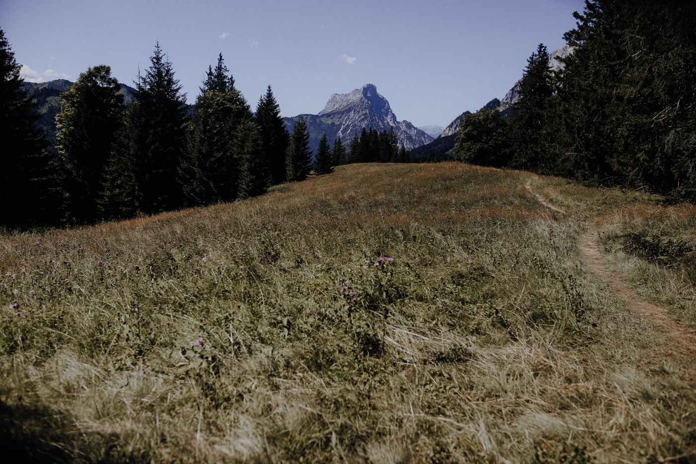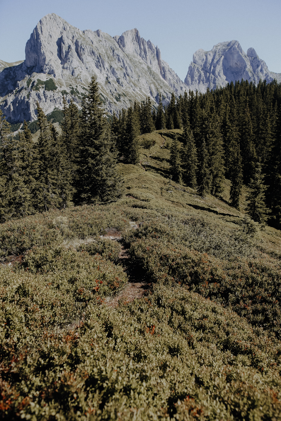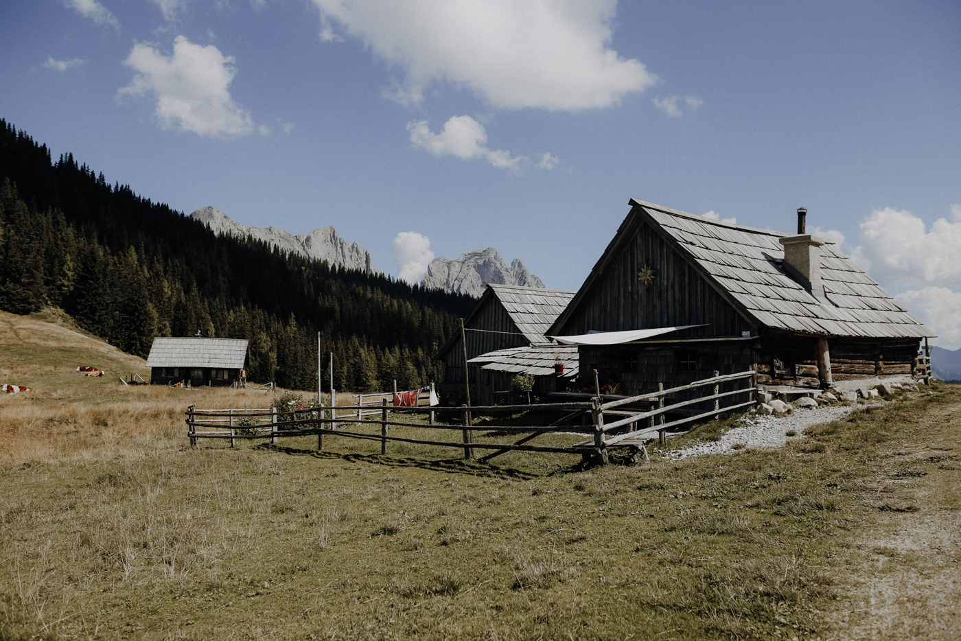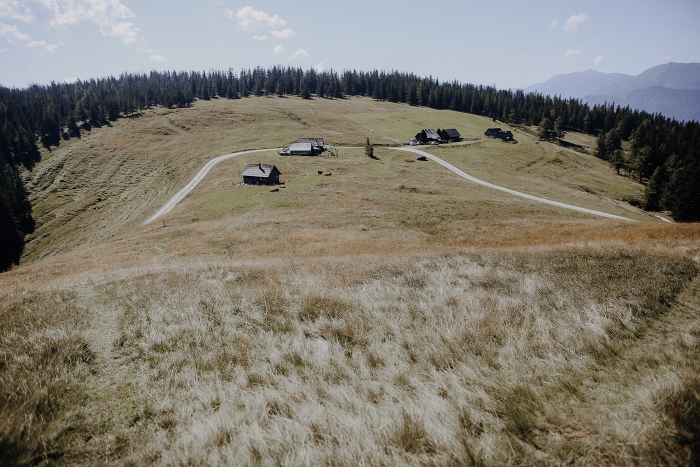 Wieder unten am Kalblinggatterl (die Kamera war zum Glück noch da) lässt das nächste Wanderhighlight aber auch nicht lang auf sich warten. Mit einem spektakulären Blick auf den Kalbling und die dahinter liegende Bergkette führt der schmale Trampelpfad durch niedrig wachsende Sträuche entlang der Baumgrenze durch die Landschaft, bis wir am Ende dieses wildromantischen Abschnitts schließlich den Lahngangkogel erreichen. Die Hitze, die inzwischen über dem Berg steht, treibt uns aber trotz des tollen Ausblicks über das Tal schnell weiter durch den Wald und hinunter zur Wagenbänkalm mit ihren beiden bewirtschafteten Hütten. Und glaubt mir, ich weiß gar nicht, wann ich mich das letzte Mal so über ein kaltes Getränk gefreut habe! Die linke der beiden Hütten (ich habe leider keine Namen gefunden) gefiel mir persönlich sehr viel besser als die rechte.