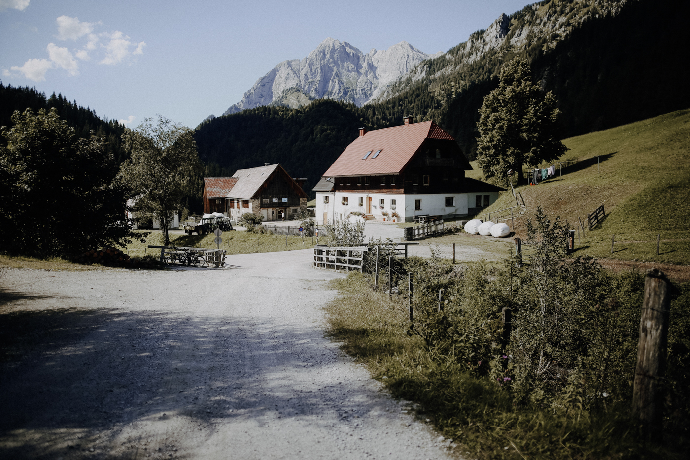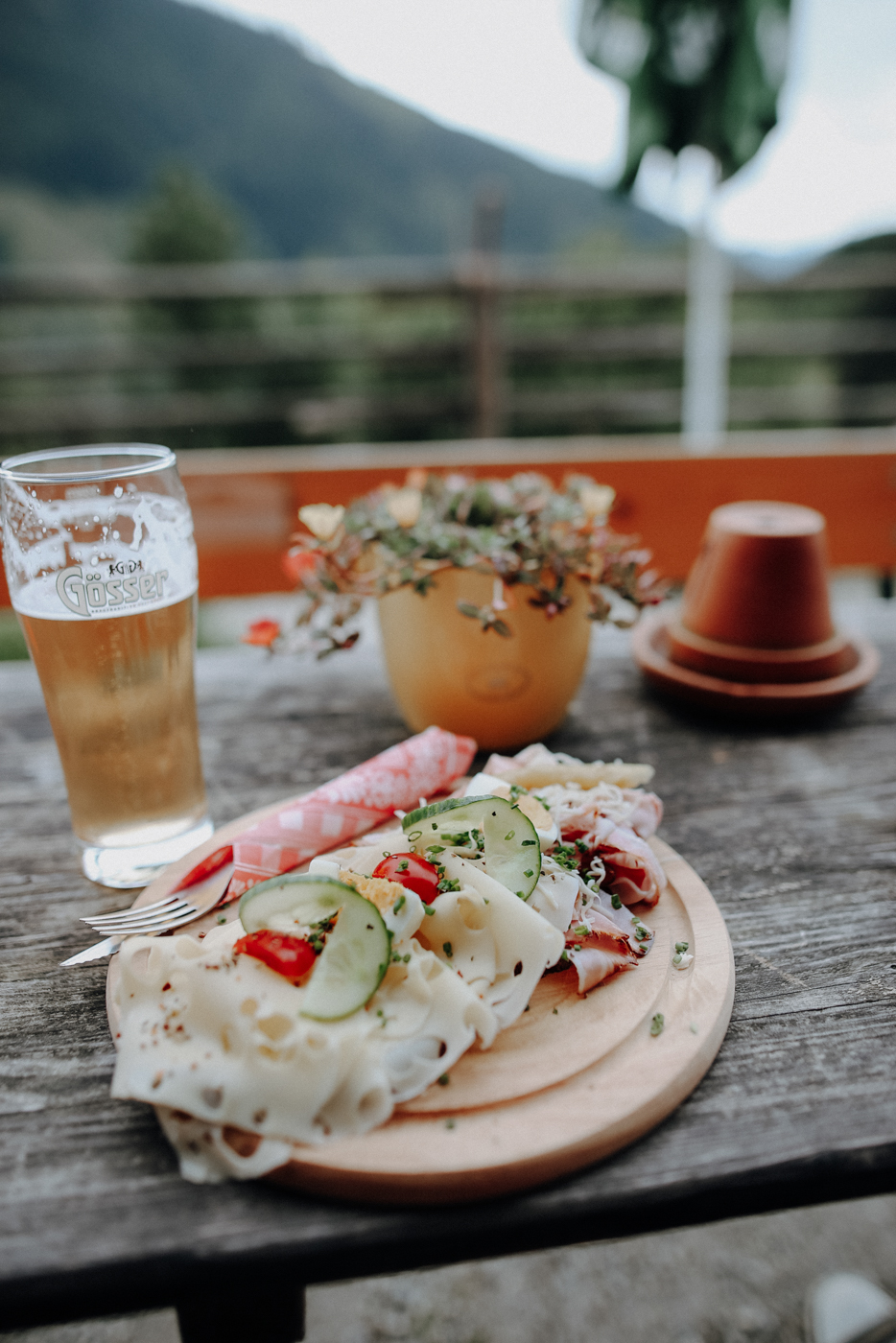 Für den Fall, dass Du schon die ganze Zeit auf das weltbeste Käsebrot gewartet hast: Hier kommt es! Bevor wir nämlich unsere Reise durch Österreich fortsetzten und nach Kärnten fuhren, machten wir einen letzten Schlenker zur Ardningalm. Dort – so wurde uns zumindest erzählt – sollte diese eine ganz besonders schöne Hütte stehen, die so gute Jausen serviert. Kurve um Kurve fuhren wir also die schmale Schotterstraße hinauf zum Wanderparkplatz an der Ardningalm. Und wirklich: Vor uns lag ein wahrer Hüttentraum inklusive meckernder Ziege und supersympathischem Wirt in Lederhosen. Also taten wir, wofür wir hergekommen waren: Wir bestellten ein Käsebrot. Und was für eines! Dick belegt mit würzig duftend mit frisch gebackenem Brot und rahmiger Butter – natürlich im perfekten Brot-Käse-Verhältnis. Wenn Du jetzt schmunzeln solltest, ob man tatsächlich so viel über Käsebrote philosophieren kann, dann frag mal Helge Schneider. Ich wette in seinem Käsebrot-Song hat er über eines von der Ardningalm Hütte gesungen! 😉
