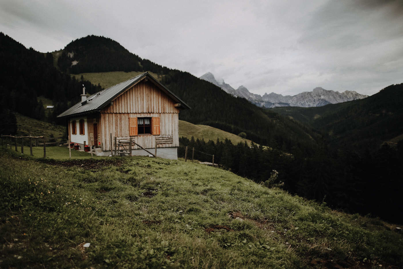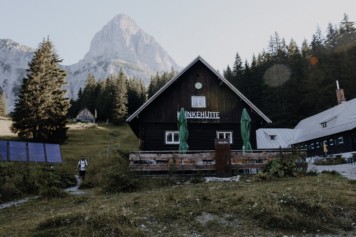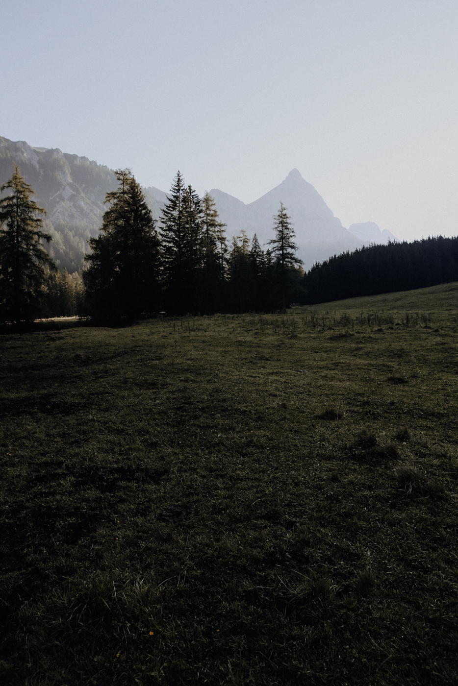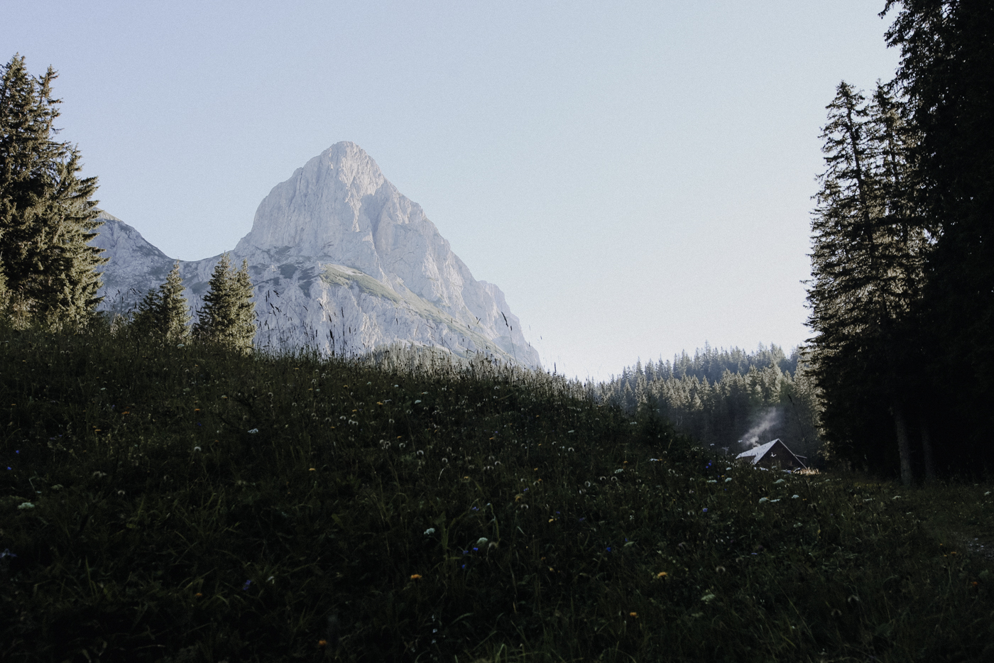 Spätestens als wir den Gipfel des Admonter Kalbling das erste Mal in der goldenen Abendsonne leuchten sahen, wussten wir: Da wollen wir hin! Glücklicherweise fanden wir auch gleich eine tolle Tour über die Klinke Hütte und die Wagenbänkalm. Noch vor Sonnenaufgang parkten wir also das Auto an der Kaiserau und marschierten los. Zu Beginn führt der Weg vor Berggipfeln an einem Bach entlang über eine riesige Wiese, bevor der erste Teil des Aufstiegs begann. Pünktlich zum Frühstück erreichten wir über Waldwege die Klinke Hütte, während sich die Sonne über die mächtige Südflanke des Kalblings schob – der perfekte Zeitpunkt für den Gipfel. Nach Brot und Kaffee ging es zunächst über eine Kuhweide und später über einen schmalen, steinigen Pfad über die Nordseite zum Gipfel. Und was mache ich? Ich Idiotin lasse meine Kamera an der Hütte liegen. Irgendwo zwischen Panik und Wutanfall gelingt es mir am Ende zum Glück dank Gipfel-Euphorie trotzdem noch den atemberaubenden Blick zu genießen.