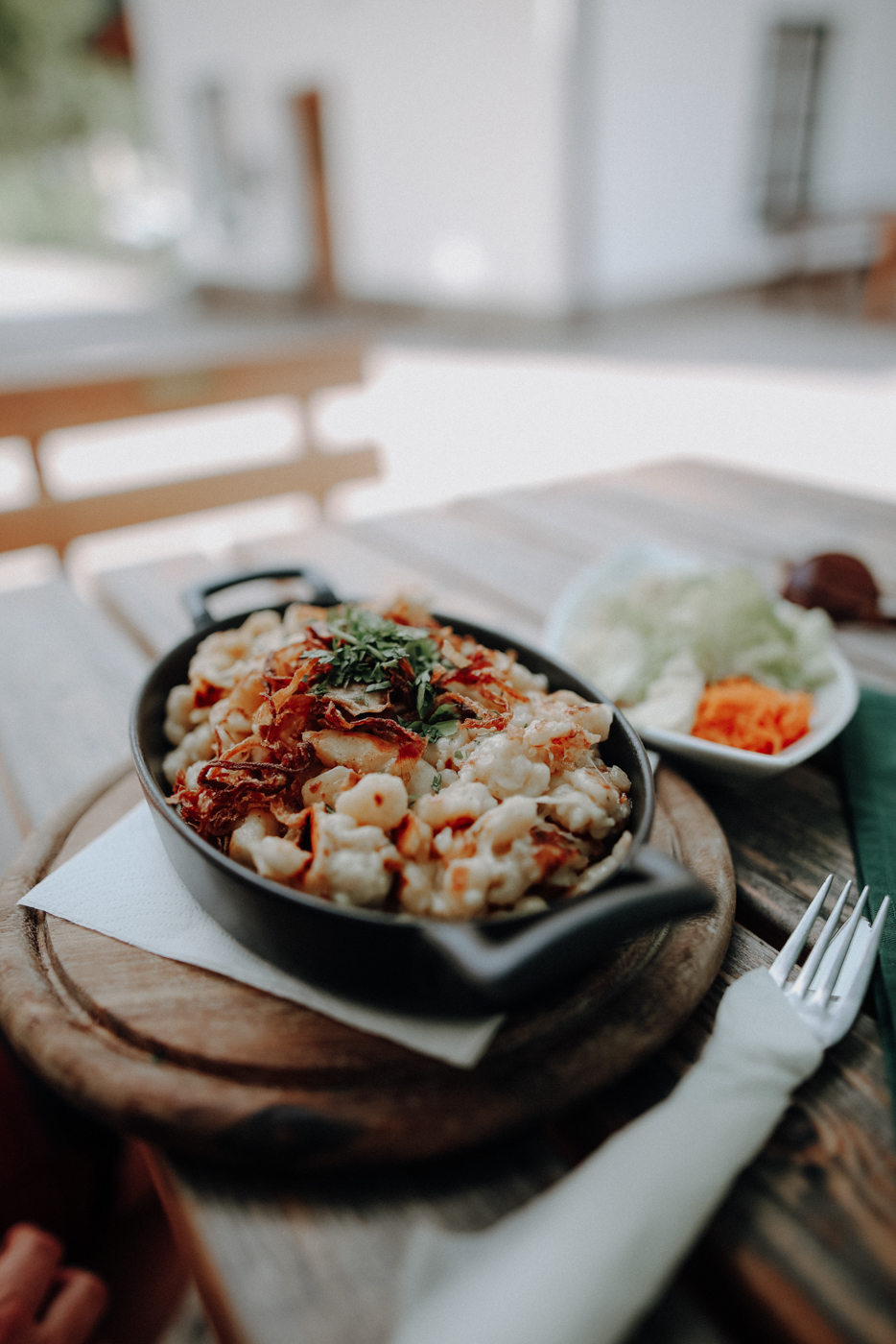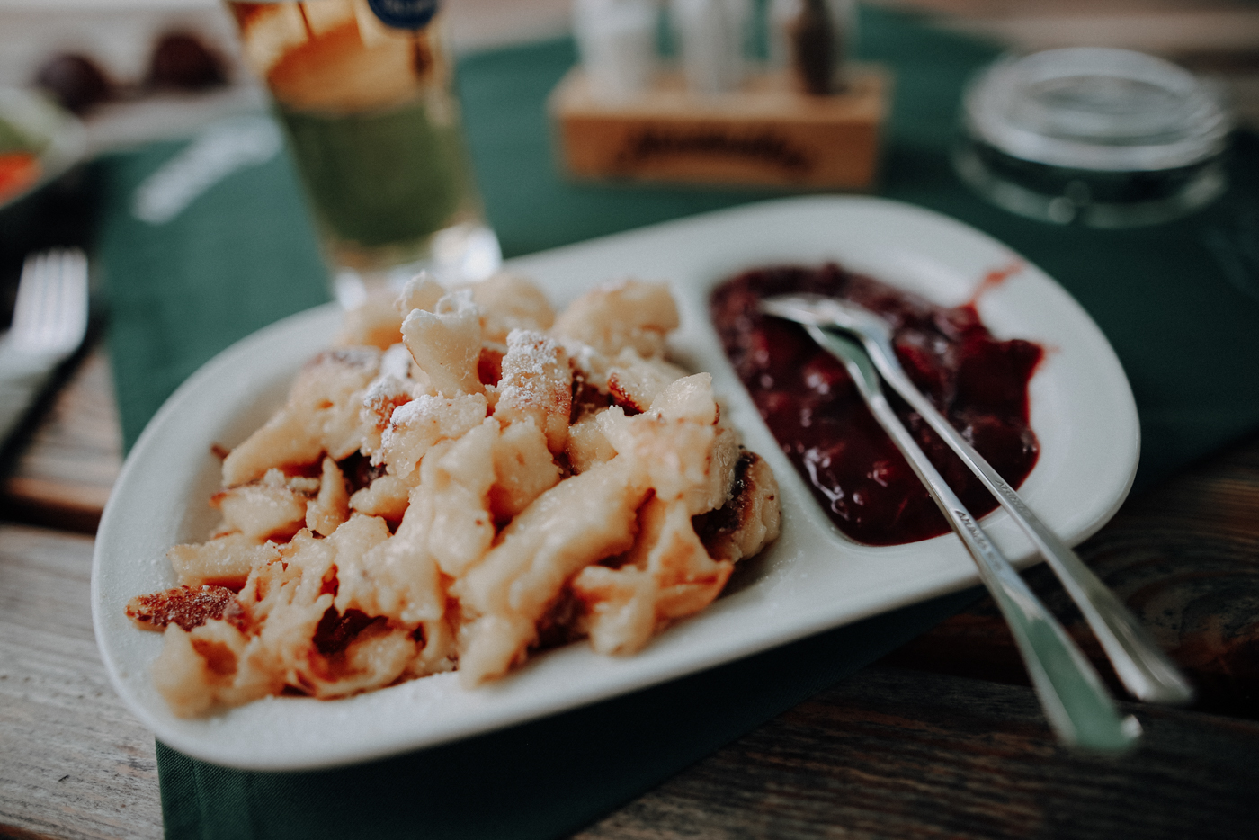 Weil wir natürlich neugierig waren, haben wir schließlich tatsächlich an jeder einzelnen Hütte Halt gemacht, um wenigstens bei einem kalten Getränk die Almromantik zu genießen. Beim Ankommen in den Bergen sollte man eben keine Kompromisse eingehen. 😉 Mein Fazit: Während der Hof der Ebneralm wohl der schönste ist, gibt es an der Zeiringeralm den leckersten Kuchen und an der Huberalm den romantischsten Almblick. Den größten Hunger haben wir jedoch extra bis zum Schluss ausgehalten, um am Ende 2,5 km unterhalb des Startpunkts beim Kölblwirt die hochgelobten Käsespätzle und den Kaiserschmarrn zu essen. Und wirklich: Beide Gerichte waren so unglaublich lecker und frisch zubereitet, dass wir sogar später ein zweites Mal hergekommen sind – dann aber nur fürs Essen.