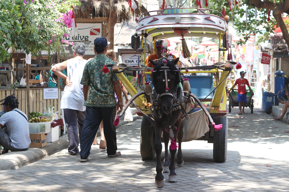 Einige Tage unserer Reise durch Indonesien verbrachten wir auf den kleinen Gili-Inseln vor Lombok. Gili Trawangan, die Insel, auf der wir waren, ist wohl die bekannteste. Neben ihr liegen Gili Air & Gili Meno, beide bedeutend ruhiger, vielleicht auch ein bisschen schöner. Auf den Gili-Inseln gibt es keine Autos und keine Motorräder, am besten ist man zu Fuß oder mit dem Fahrrad unterwegs. Wenn es schnell gehen muss, gibt es Cidomos.
