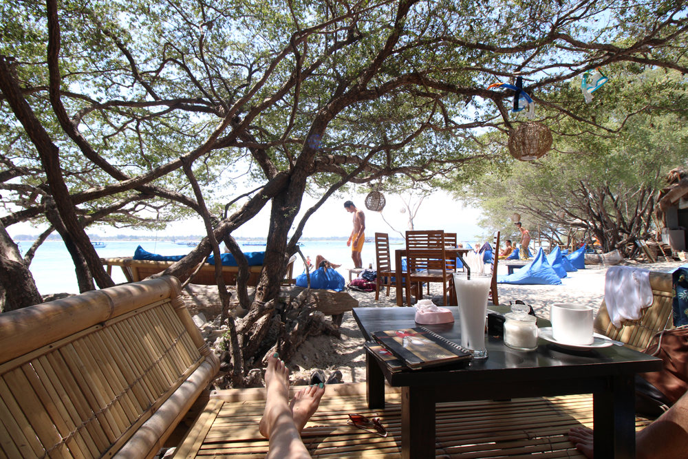 Trotz dass wir auf der belebten Party-Insel Gili Trawangan waren, genossen wir ein paar sehr entspannte, ruhige Tage. Nach ein paar frischen Früchten zum Frühstück fuhren wir mit dem Fahrrad in eine Beachbar im Norden der Insel und blieben dort bis zum Nachmittag. Die Zeit vertrieben wir uns mit guten Büchern und Schnorcheln. Den Abend verbrachten wir in Sunsetbars am Strand, hinterher gingen wir essen oder in eine der Shisha-Bars.