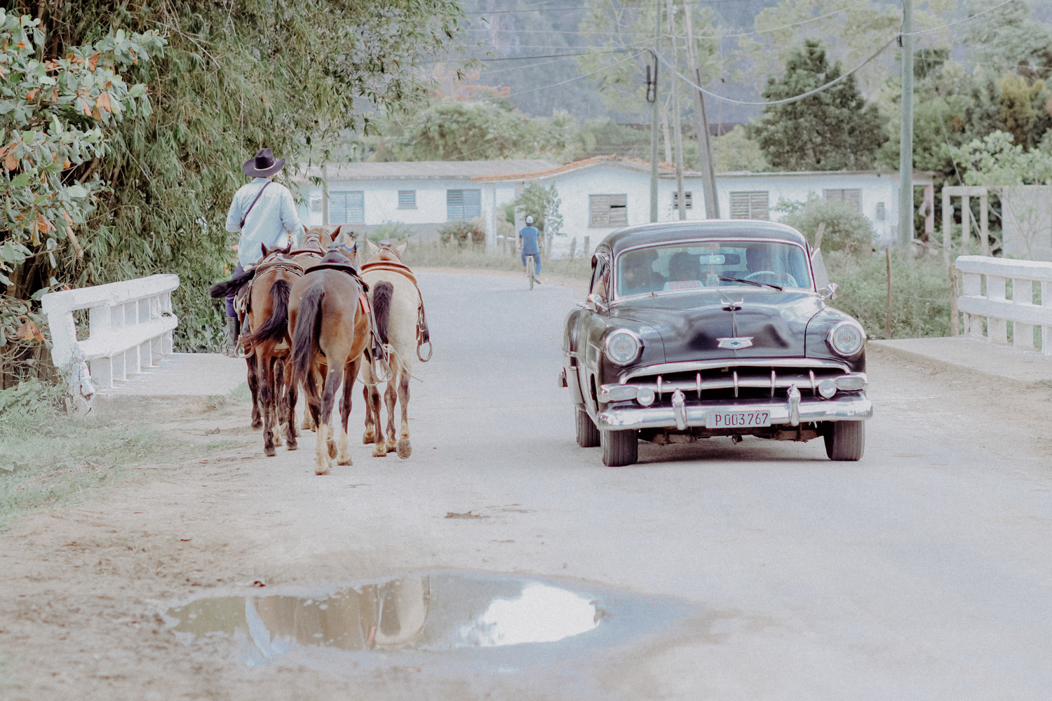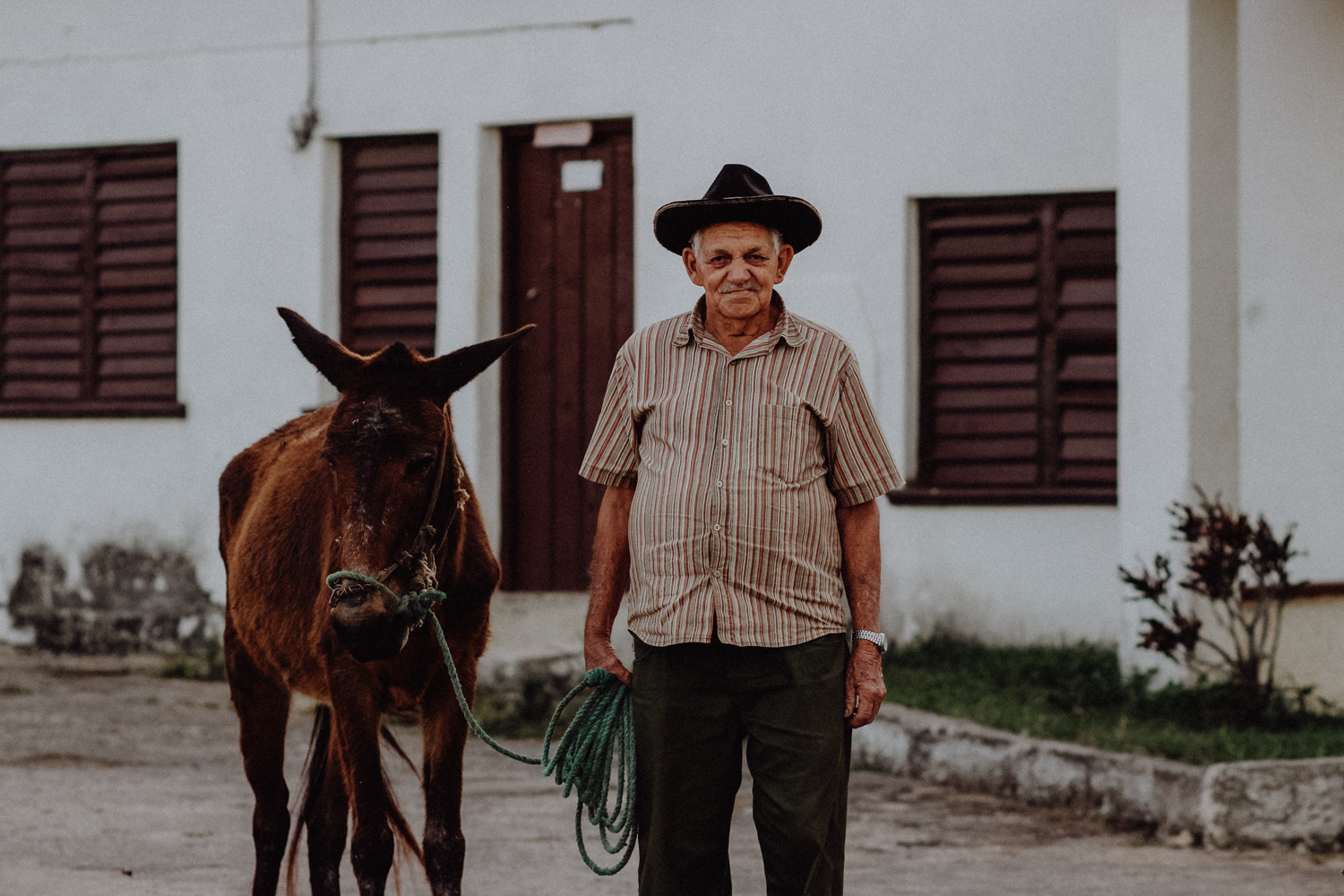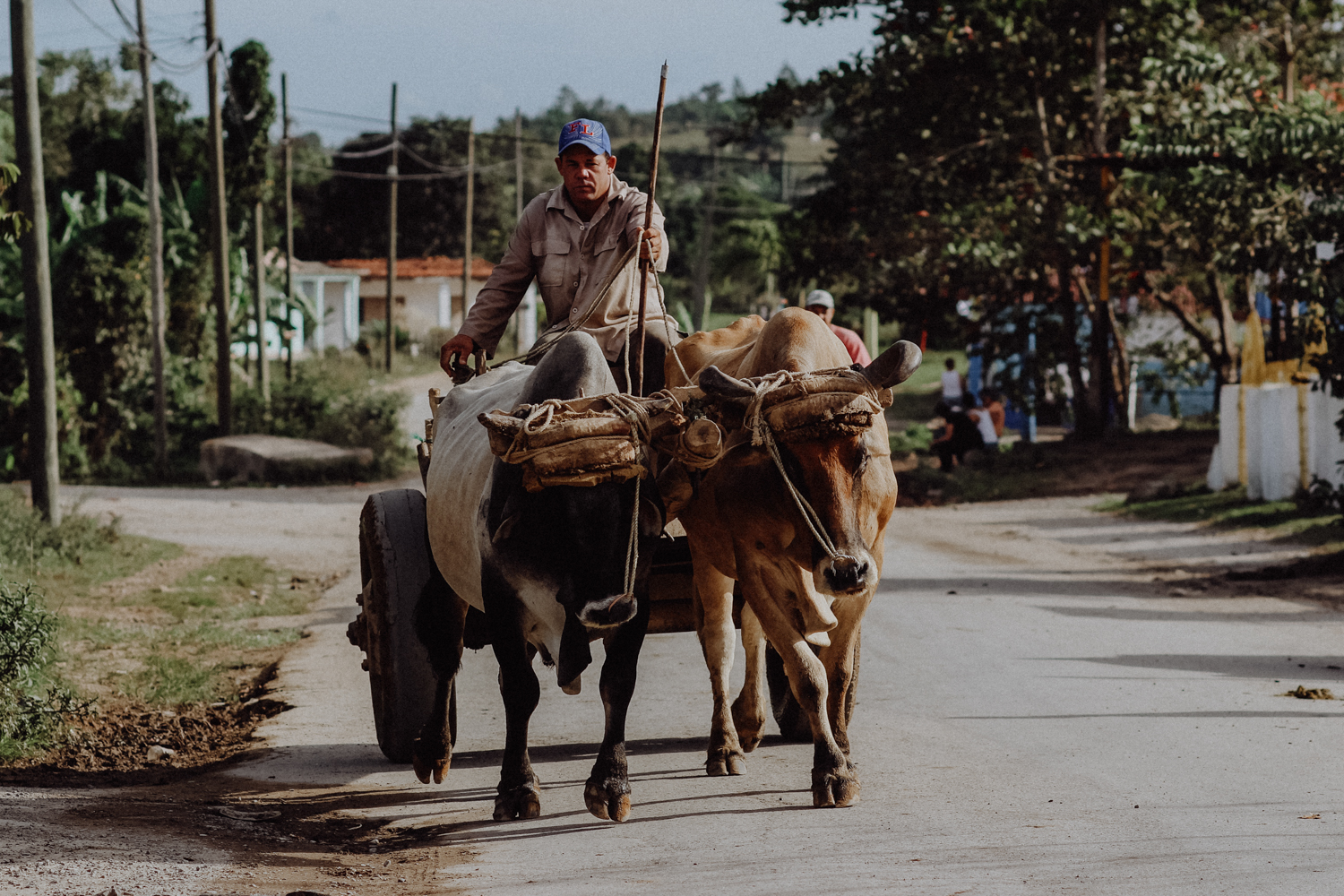 Mindestens genauso spannend wie die Wanderung ist ein Spaziergang durch die kleine Stadt. Hier in Viñales gibt es keine Hotels und abgesehen von einem kleinen Viazul Büro und dem Markt auch sonst keine touristischen Einrichtungen. Hier gibt es nur das typisch kubanische Leben. Einen Mann, der seinen Esel spazieren führt, Menschen, die mit einem Traktor, der zum Bus umfunktioniert wurde von Arbeit kommen, Ochsen- und Pferdekarren neben Oldtimern, die Pferdebesitzer und Bauern, spielende Kinder und Frauen in Schaukelstühlen vor den bunten Fassaden ihrer Häuser.