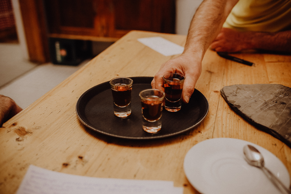 Eine halbe Stunde später, schwindelig und froh, endlich aus dem Auto aussteigen zu können, betreten wir seine Hütte. Statt in den Gastraum zu den anderen Gästen, führt er uns geradewegs durch die Küche in den Pausen- und Arbeitsraum seines Personals. Noch immer leicht desorientiert setzen wir uns gemeinsam an den großen Holztisch.