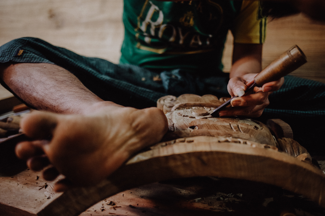 Wesentlich angenehmer ist es dann ein paar Meter weiter in den Schnitzereien, in denen mindestens ebenso große Figuren mit unglaublich detailreichen Verzierungen oder auch die traditionellen Marionetten aus Teakholz geschnitzt werden. In keiner dieser Werkstätten hatten wir dabei das Gefühl, dass uns jemand zum Kaufen drängen würde – ganz im Gegenteil: Man konnte den Künstlern und Handwerkern ganz entspannt bei der Arbeit zusehen.