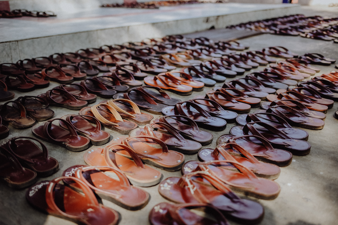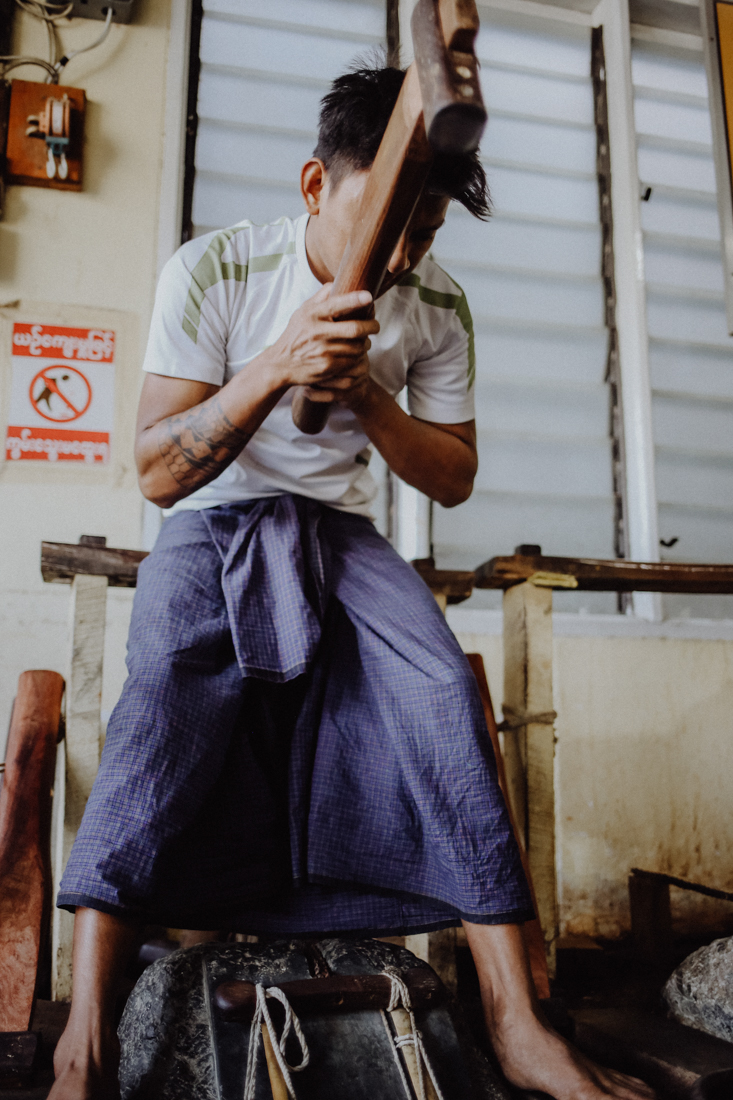 Neben den Goldschlägereien gibt es aber auch noch andere interessante Werkstätten in Mandalay, die wir so auch an keinem anderen Ort wieder gesehen haben. Direkt an der Mahamuni Pagode an der Straße, die nach Sagaing führt, gibt es mehrere Werkstätten, in denen riesige Buddha Statuen aus Stein gehauen werden. Durch die Sandstrahler ist die Luft so wahnsinnig staubig, dass es völlig unklar ist, wie die Steinhauer das Tag für Tag meist auch noch ohne Atemschutz aushalten.
