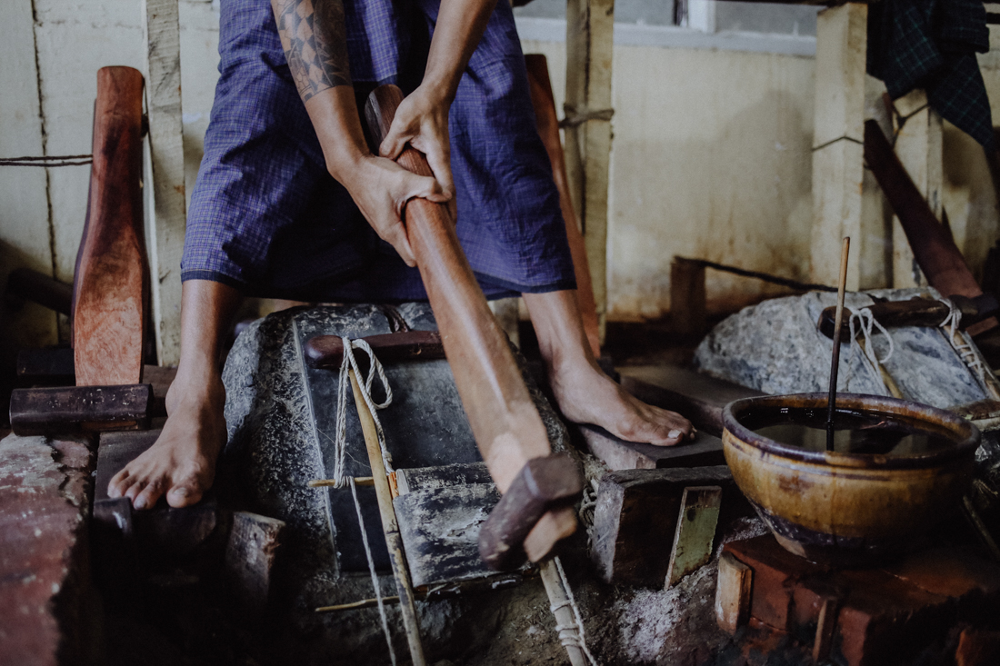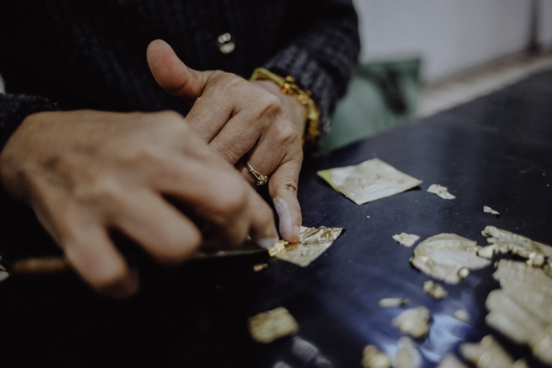 Das Blattgold für dieses Ritual wird in den Goldschlägereien der Stadt hergestellt. In über zwei Blocks erstrecken sich dutzende Spezialwerkstätten, in denen die hauchdünnen Blattgoldstückchen von Hand geschlagen werden. In Souvenirgeschäften wie King Galon kann man sich den aufwändigen Prozess sogar zeigen lassen und gewinnt einen Eindruck, von der schweren körperlichen Arbeit, wenn die jungen Männer tausendfach am Tag mit schweren Hämmern auf die Goldstücken einschlagen.