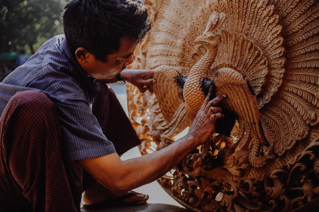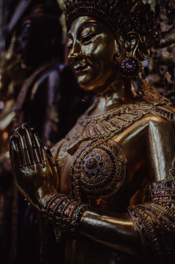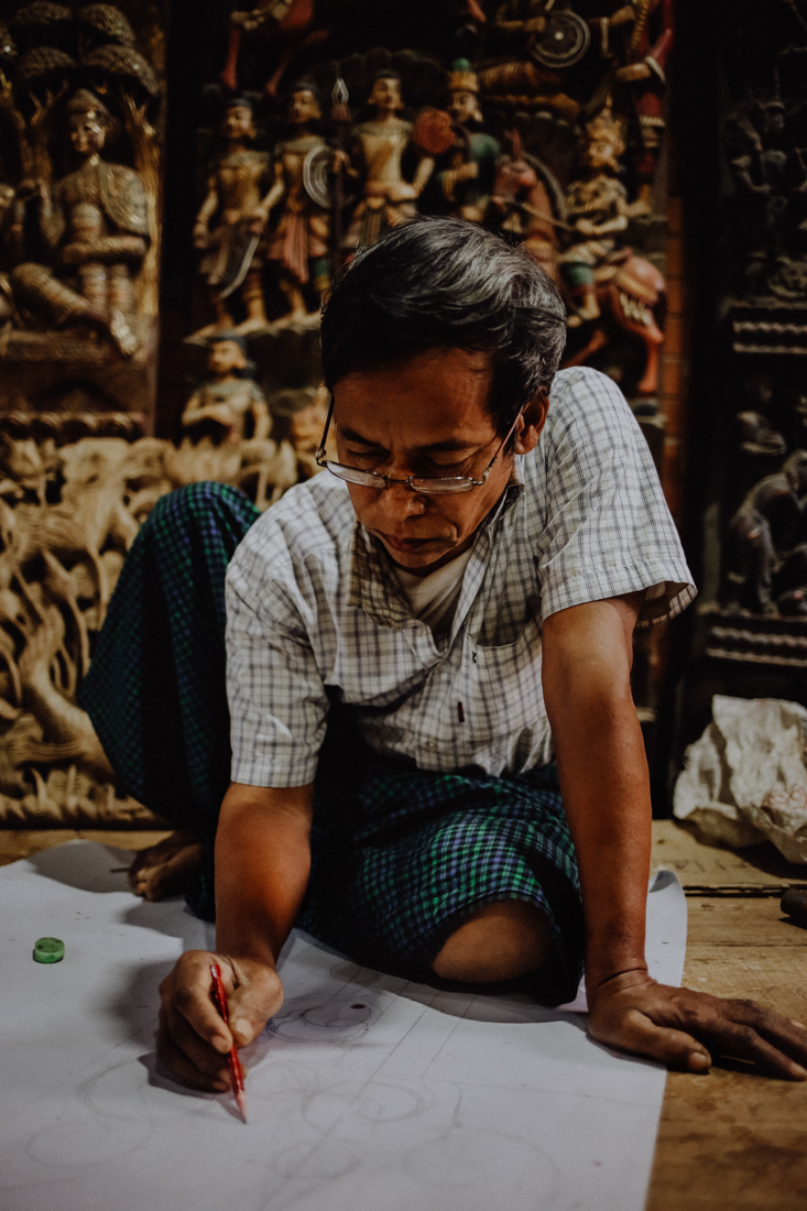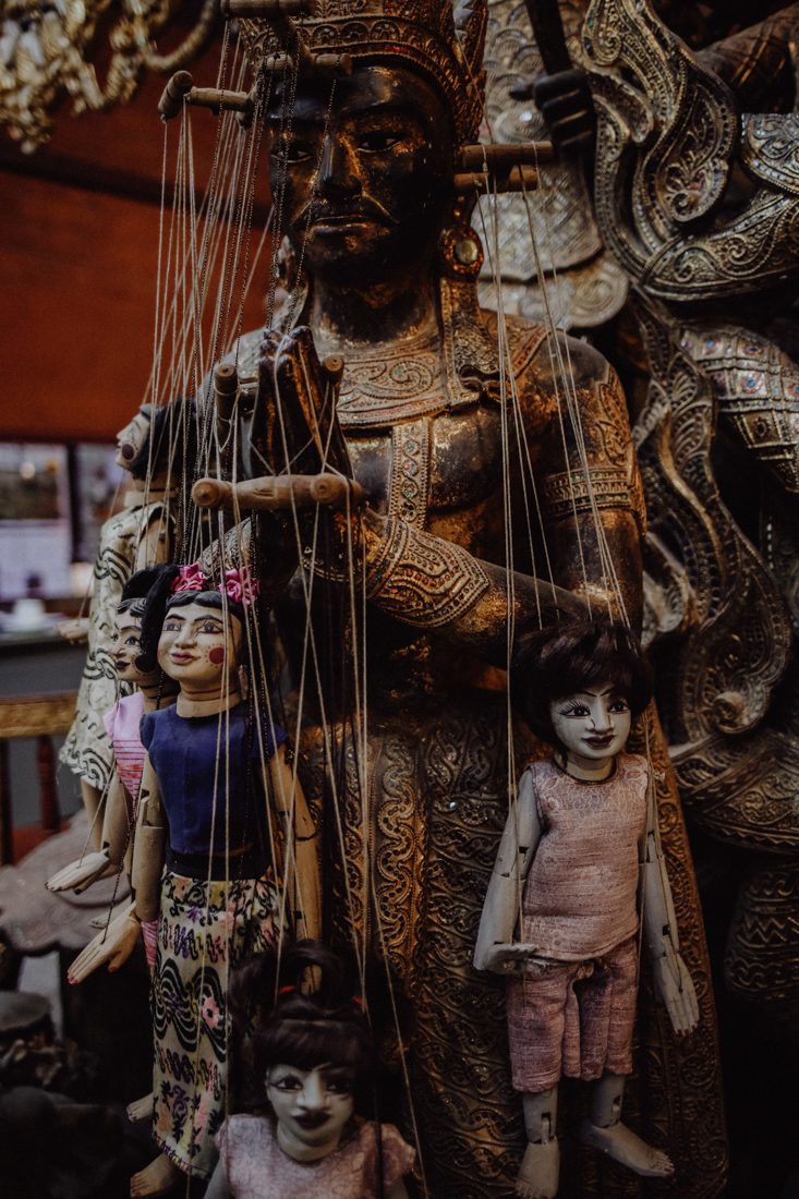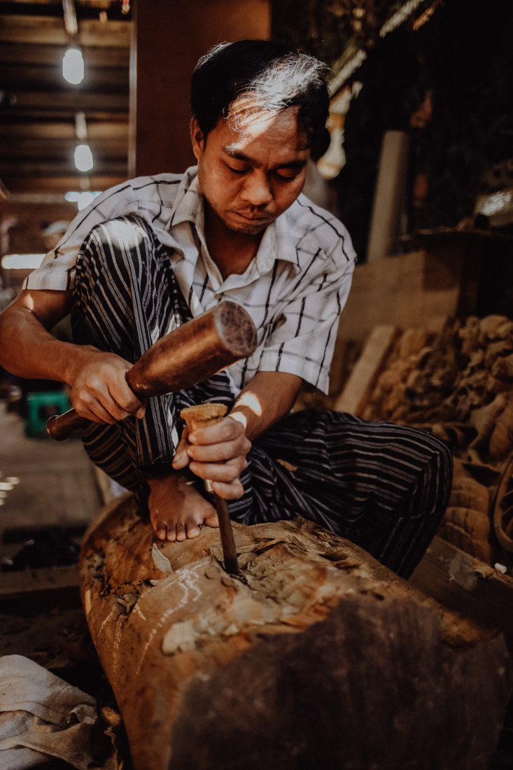 Wesentlich angenehmer ist es dann ein paar Meter weiter in den Schnitzereien, in denen mindestens ebenso große Figuren mit unglaublich detailreichen Verzierungen oder auch die traditionellen Marionetten aus Teakholz geschnitzt werden. In keiner dieser Werkstätten hatten wir dabei das Gefühl, dass uns jemand zum Kaufen drängen würde – ganz im Gegenteil: Man konnte den Künstlern und Handwerkern ganz entspannt bei der Arbeit zusehen.