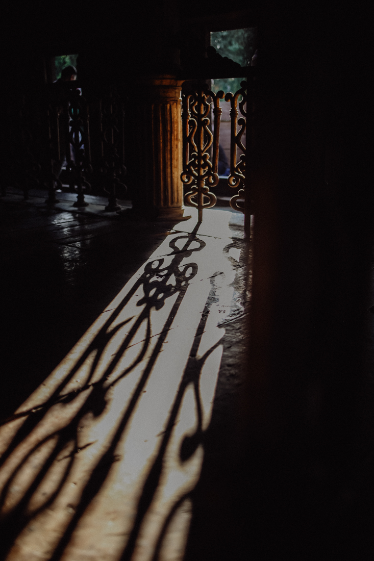 Dabei zeichnen die Ornamente der Geländer bei tiefstehender Sonne ganz zauberhafte Muster auf Böden und Wände, sodass trotz der Dunkelheit eine ganz magische Stimmung entsteht. Nur auf die Füße muss man ein bisschen aufpassen, da die Holzdielen auf dem Boden teilweise ganz schön brüchig sind und hin und wieder sogar Nägel aus ihnen herausragen.