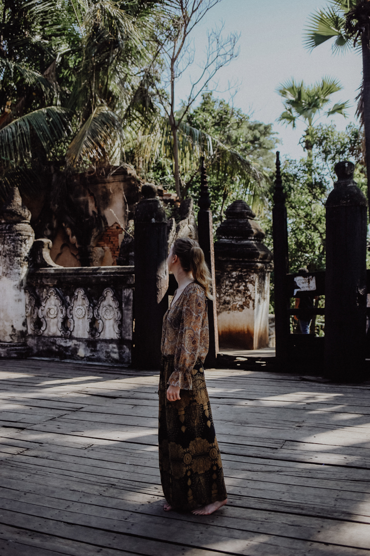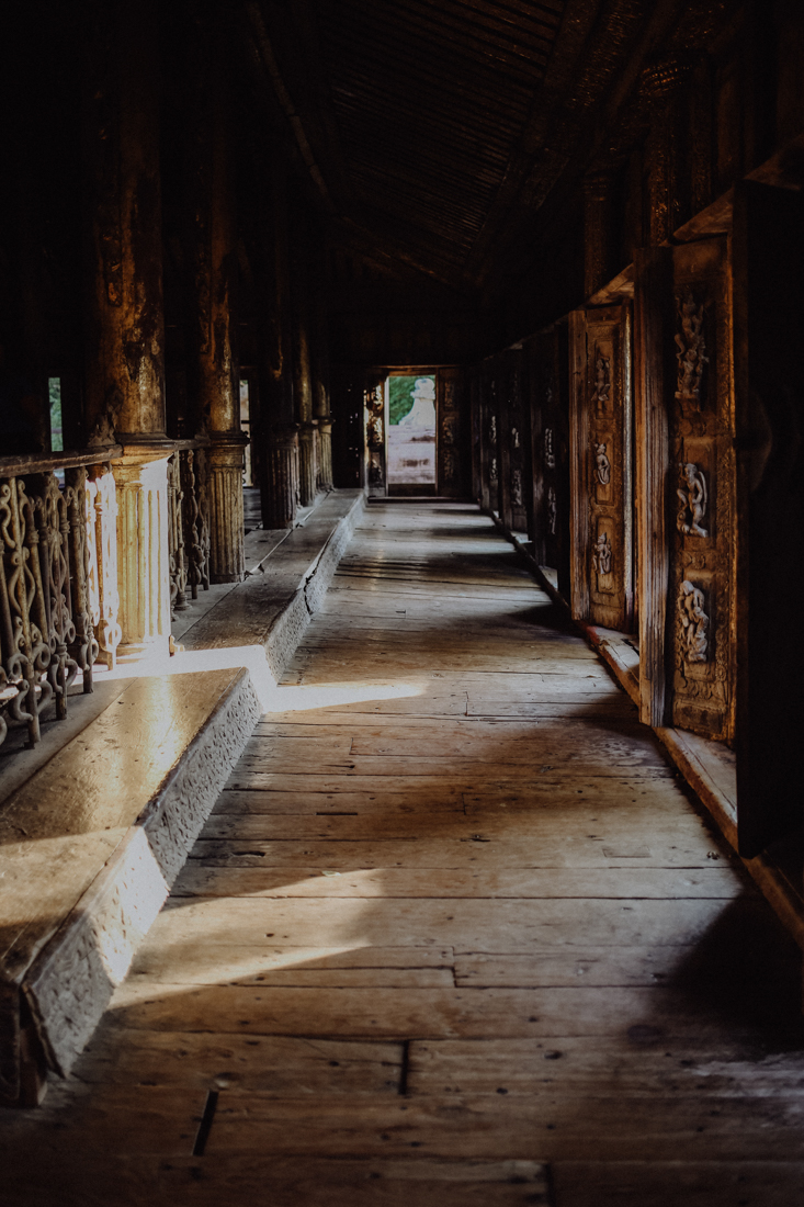 Ganz besonders hübsch war es außerdem am nahgelegenen Shwenandaw Kloster. Der Bau steht erhaben aus Holzpfählen und besteht ganz und gar aus Teakholz, das über und über mit detailreichen Holzschnitzereien verziert ist. Durch die dunkle Farbe vom Holz sind die Innenräume sehr dunkel und werden nur schwach vom einfallenden Sonnenlicht erleuchtet.