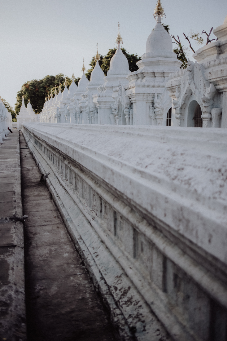 In Mandalay steht eine der wohl schönsten Pagoden, die wir während unserer Reise durch Myanmar besichtigt haben. In jeder der 729 weißen Stupas liegt jeweils eine Marmorplatte, auf denen auf Pali das Leben und die Lehren Buddhas niedergeschrieben sind. Damit gelten die Schriften in der Kuthodaw Pagode als das größte Buch der Welt. Allein für diese 729 Platten war ein “Redaktions-Ensemble” von mehr als 200 Personen nötig. König Mindon, einer der meist verehrtesten Könige des Landes, ließ bei einer Zusammenkunft das Buch einmal nonstop von 2400 Mönchen rezitieren, die dafür sage und schreibe sechs Monate gebraucht haben!