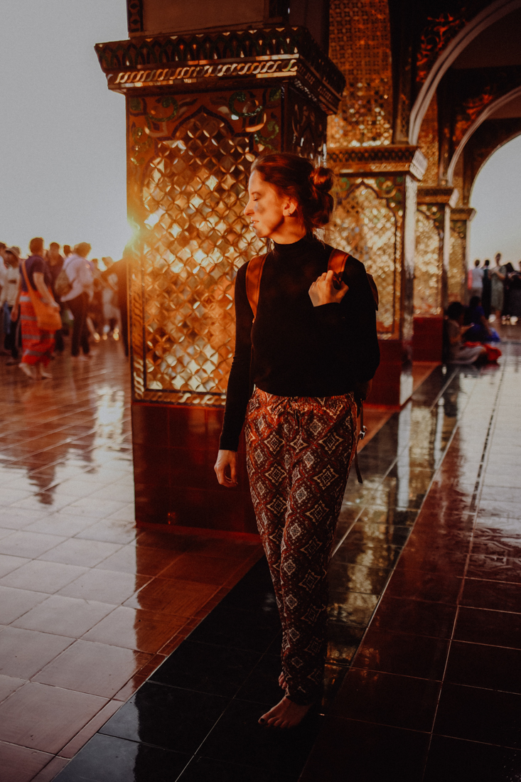 Noch viel hübscher als der Ausblick selbst sind dann aber, wenn sich die Sonne senkt und den Himmel in goldene Töne taucht, die Spiegelung in den unzähligen Mosaiken der Pagode. Es scheint dann, als würde die Luft selbst funkeln, wenn man zwischen den Säulen hindurchgeht und die Gesichter der Menschen leuchten lässt.