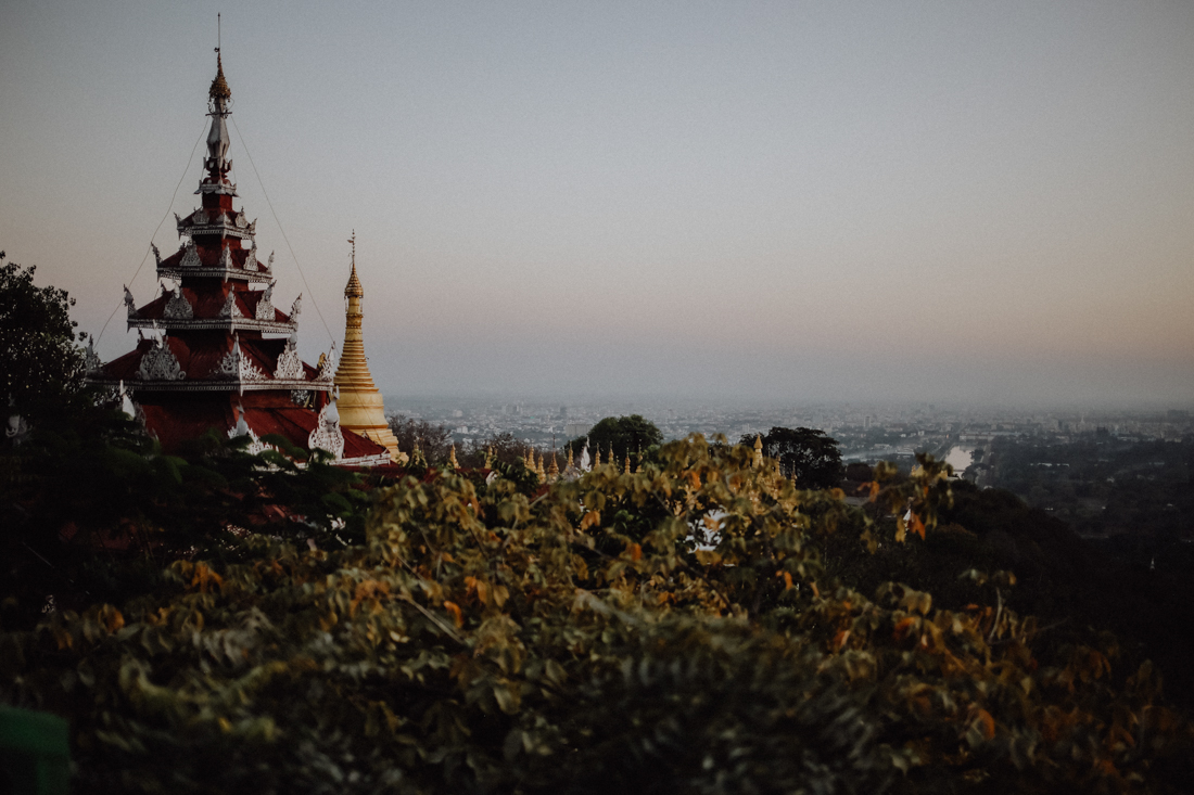 Obligatorisches Sonnenuntergangs-Programm in Mandalay ist der Mandalay Hill, ein Berg von immerhin 232 m Höhe, auf dessen Kuppe eine – man kann es erahnen – große Pagode steht, von der aus man einen fantastischen Blick über die Stadt hat. Von hier oben lassen sich auch besonders gut die Ausmaße des Königspalastes und seines Grundstücks überblicken. Immerhin ist das Gelände an jeder Seite von einer jeweils zwei Kilometer langen Stadtmauer umgeben.