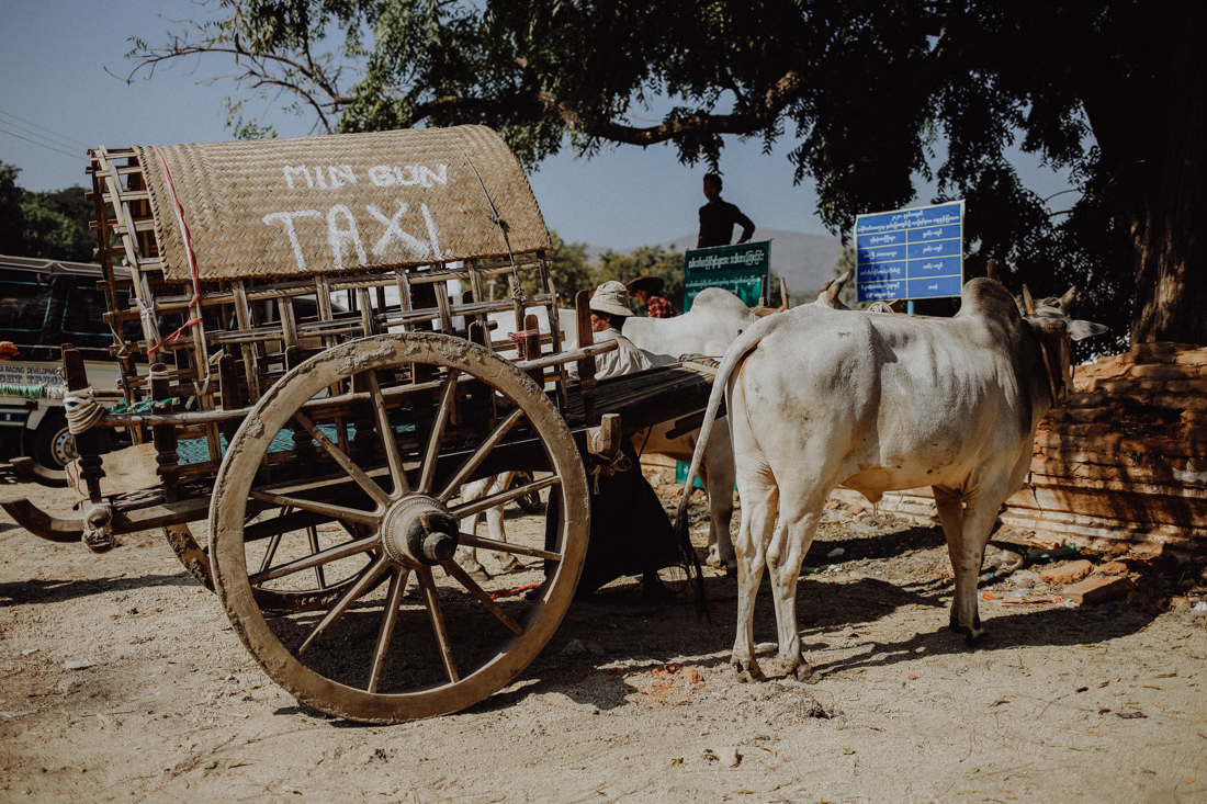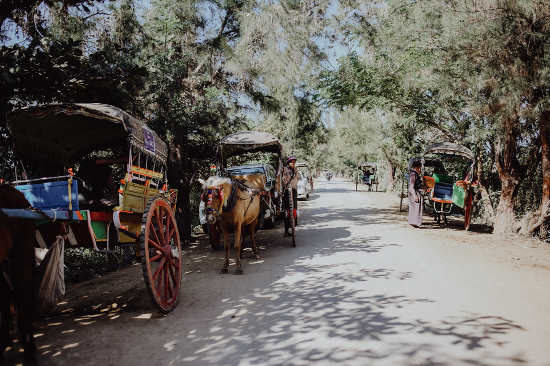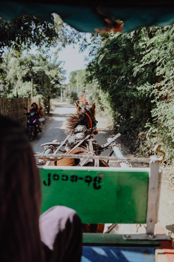Nach einem Mittagessen unterwegs fuhren wir weiter in Richtung Inwa – dem wohl mit Abstand landschaftlich schönsten Ort unseres Ausflugs. Da der Weg über die nächstgelegene Autobrücke einen riesigen Umweg bedeutet, setzen einen die Taxifahrer an einem kleinen Anleger an einem schmalen Nebenfluss des Irrawaddy ab. Für 1.500 Kyat fährt das Boot einen in weniger als 10 Minuten auf die andere Seite des Flusses. Dort warten dann jede Menge Pferdekutschen, die die Touristen durch die weitläufige Landschaft bringen. Inzwischen gibt es neben den Pferdekutschen auch ein paar Roller zum Entleihen, doch waren die, als wir kamen, leider schon vergriffen. Da die Strecken wirklich unglaublich lang sind, blieb und also nichts anderes übrig, als trotz aller Bedenken wegen der offensichtlich schlechten Haltungsbedingungen für die Pferde, auf eine Kutsche zurückzugreifen.