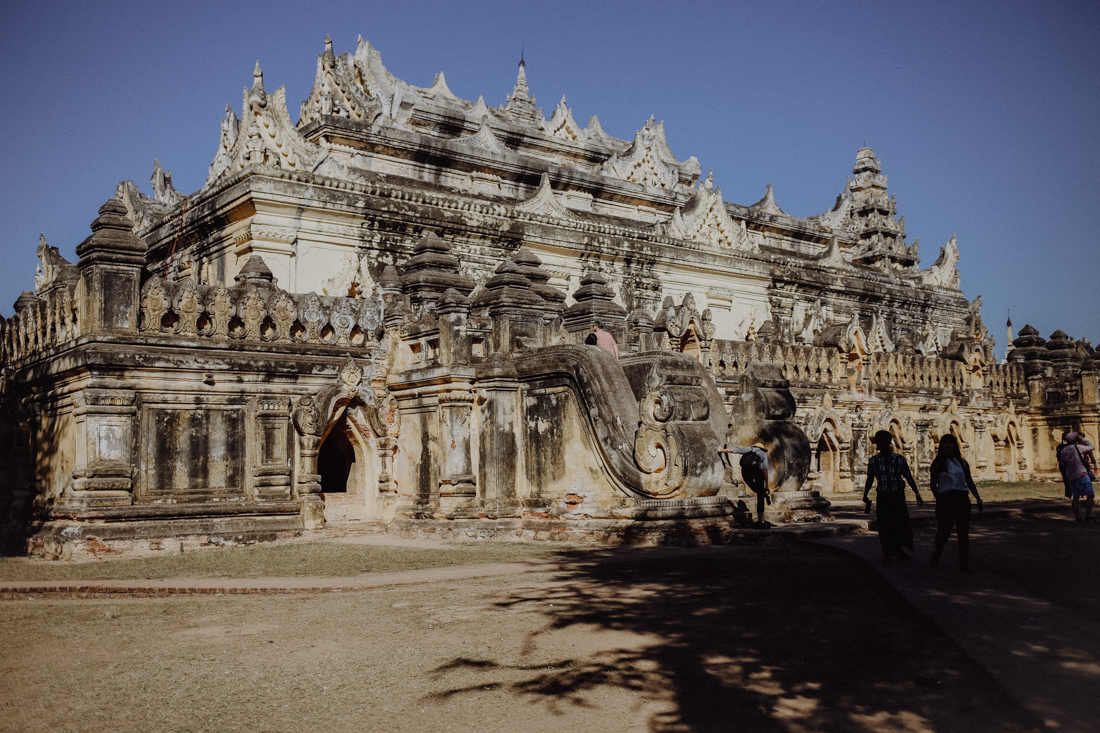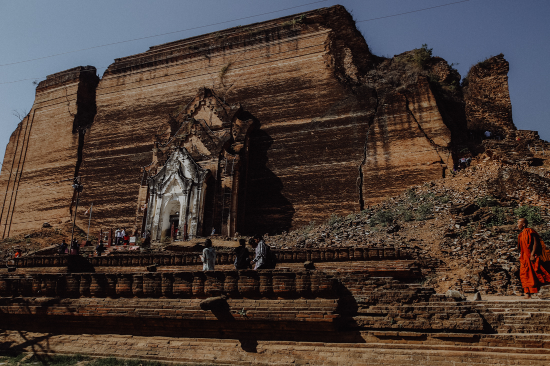 Nicht weniger spannend sind aber auch die Mingun Pagode und die Glocke von Mingun. Die Pagode sollte einst die größte des Landes werden, bevor der Bau durch den Tod des Königs, der sie einst in Auftrag gab, eingestellt wurde. Dennoch ist die Stupa trotz dessen, dass sie nie fertiggestellt wurde die größte des Landes. Heute wird ihr Gemäuer zudem durch einen riesigen Riss geziert, die das Erdbeben 2016 auf ihr hinterließ. Selbiger König – wahrscheinlich etwas von Größenwahn getrieben – gab außerdem die riesige Glocke in Auftrag, die unweit der Pagode zu sehen ist. Am unteren Ende hat sie einen Durchmesser von fast fünf Metern, sodass man tatsächlich unter ihrem Rand hindurch ins Innere kriechen kann.