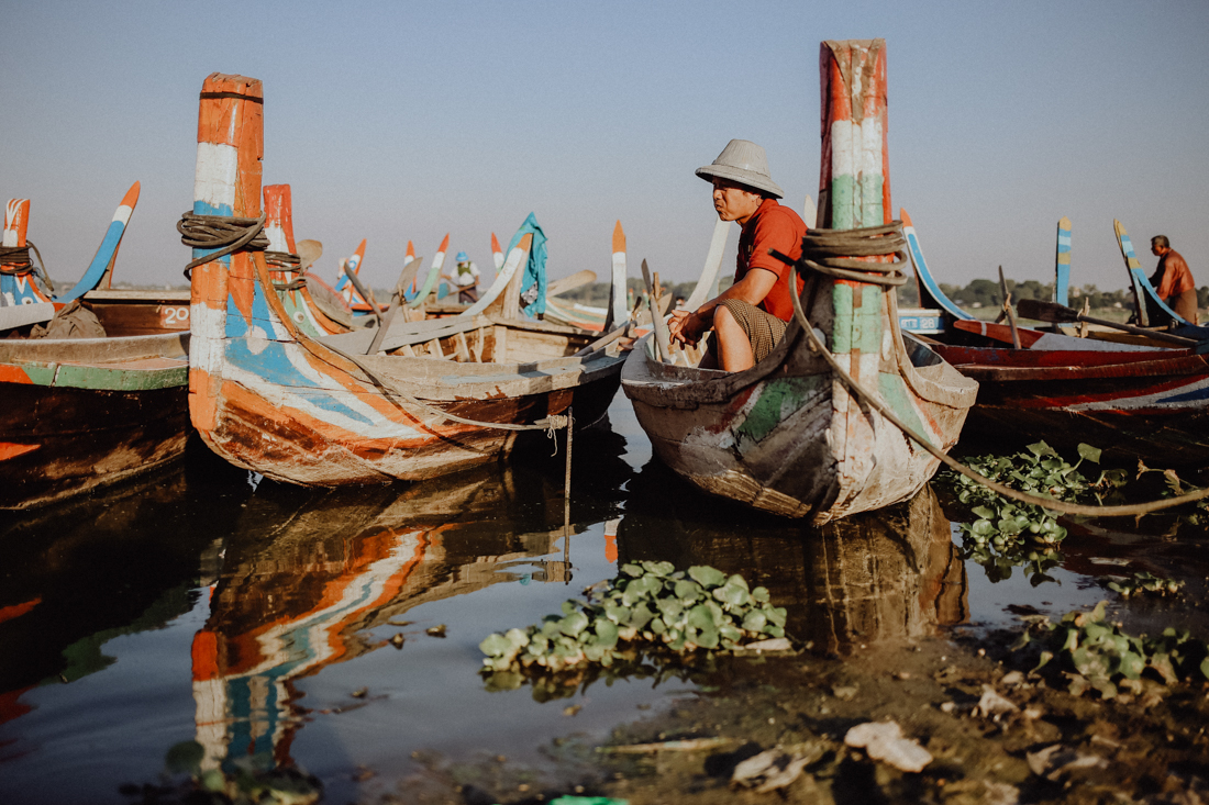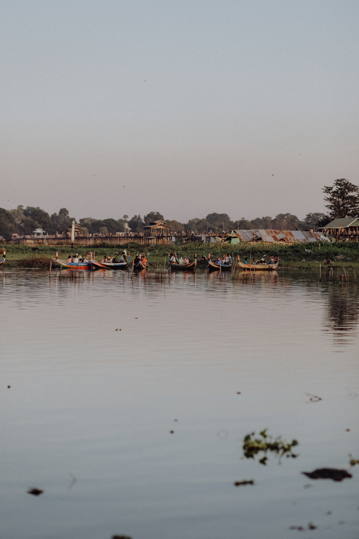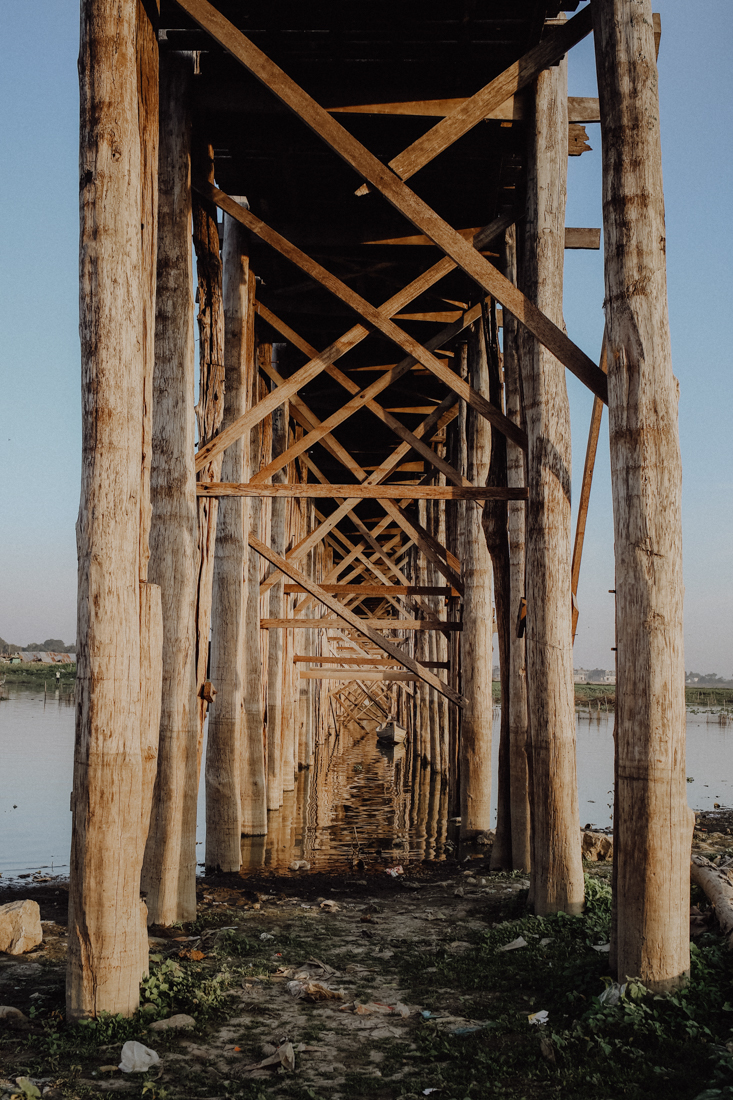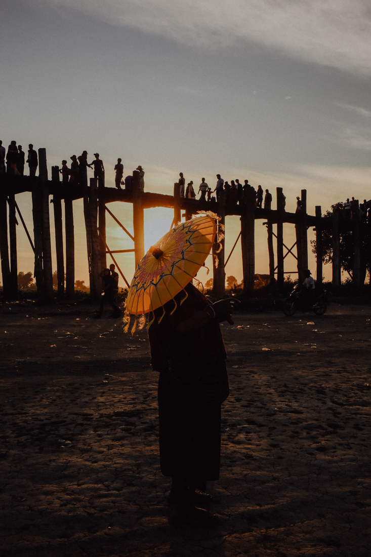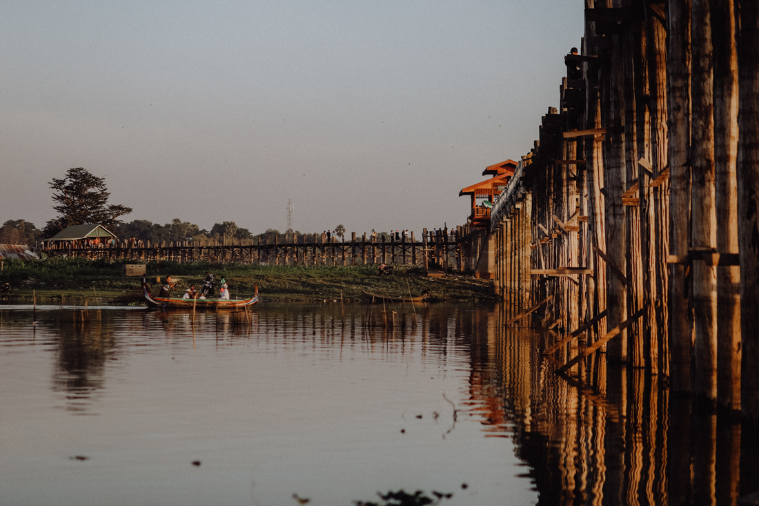 Nach unserer Rückkehr fuhren wir schließlich mit unserem Fahrer am frühen Abend zur berühmten U-Bein Brücke in Amarapura, um dort den Sonnenuntergang zu beobachten. Sicher ist das Bauwerk – eine Brücke aus Teakholz mit ganzen 1200 Metern Länge – wirklich imposant anzusehen, doch konnten wir den Hype um sie nicht ganz verstehen. Unzählige Autos, Tuktuks und Reisebusse pilgern am Abend zur Brücke und spucken ganze Menschenmassen auf den davor liegenden Souvenirmarkt aus, während die Fahrzeuge selbst das schöne Panorama versperren und Abgase in die sowieso schon dreckige Luft pusten. Am Ufer liegt dazu so viel Müll, dass wirklich niemand von einem romantischen Sonnenuntergang sprechen kann. Am besten ist es dann wahrscheinlich, sich gemeinsam mit den anderen Menschen über die Brücke zu schieben, um dem hektische Treiben am Ufer zu entkommen. Nach unserem sonst so tollen Ausflug gehört dieses Erlebnis für uns eher in die Kategorie “Been there. Done that.”