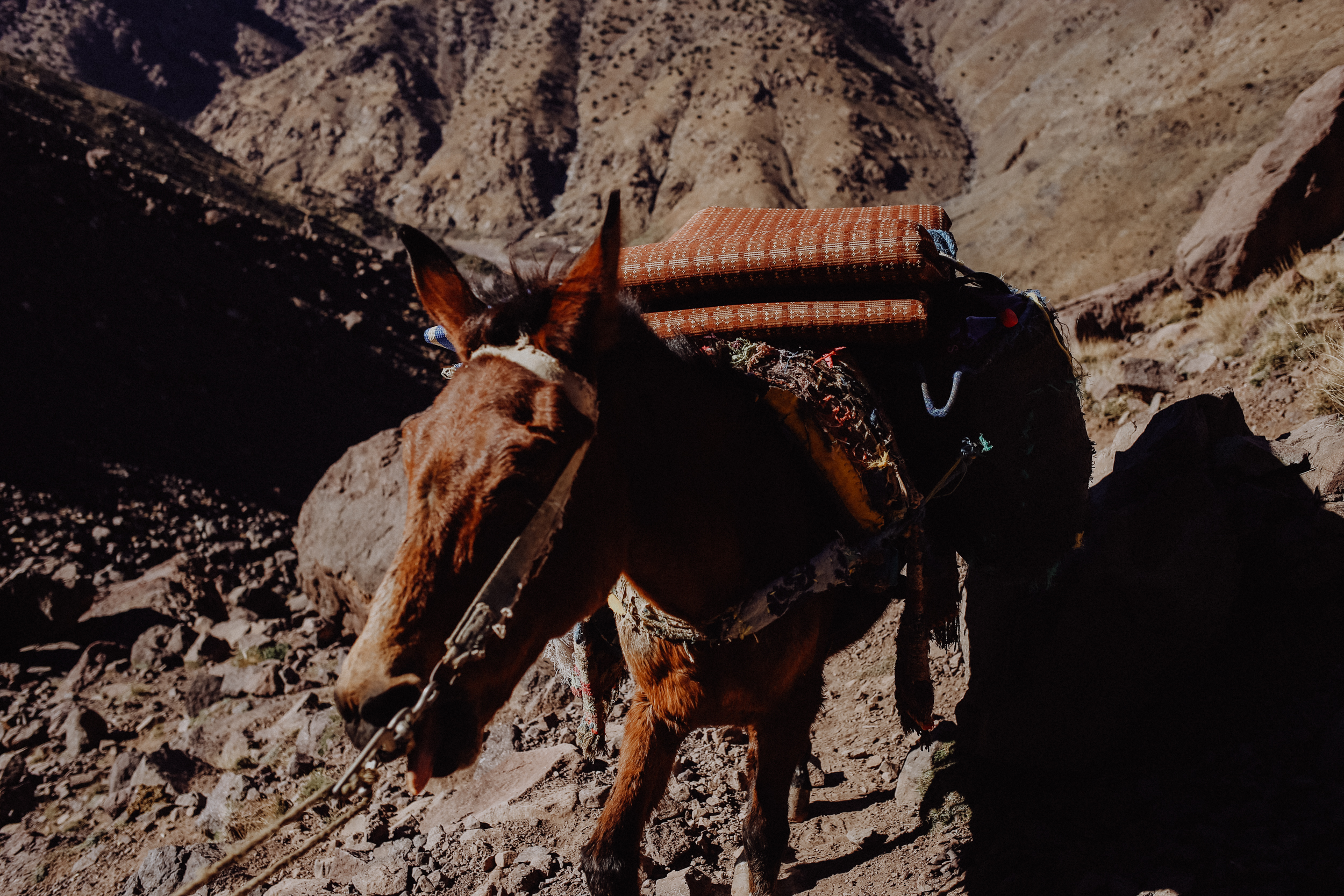 Mit meinem Guide wanderte ich von Imlil über einen nah gelegenen Pass und breite, ausgetrocknete Flussbetten mit atemberaubenden Aussichten auf die umliegenden Berge und Täler und natürlich auch auf den Jbel Toubkal, den höchsten Berg Nordafrikas.