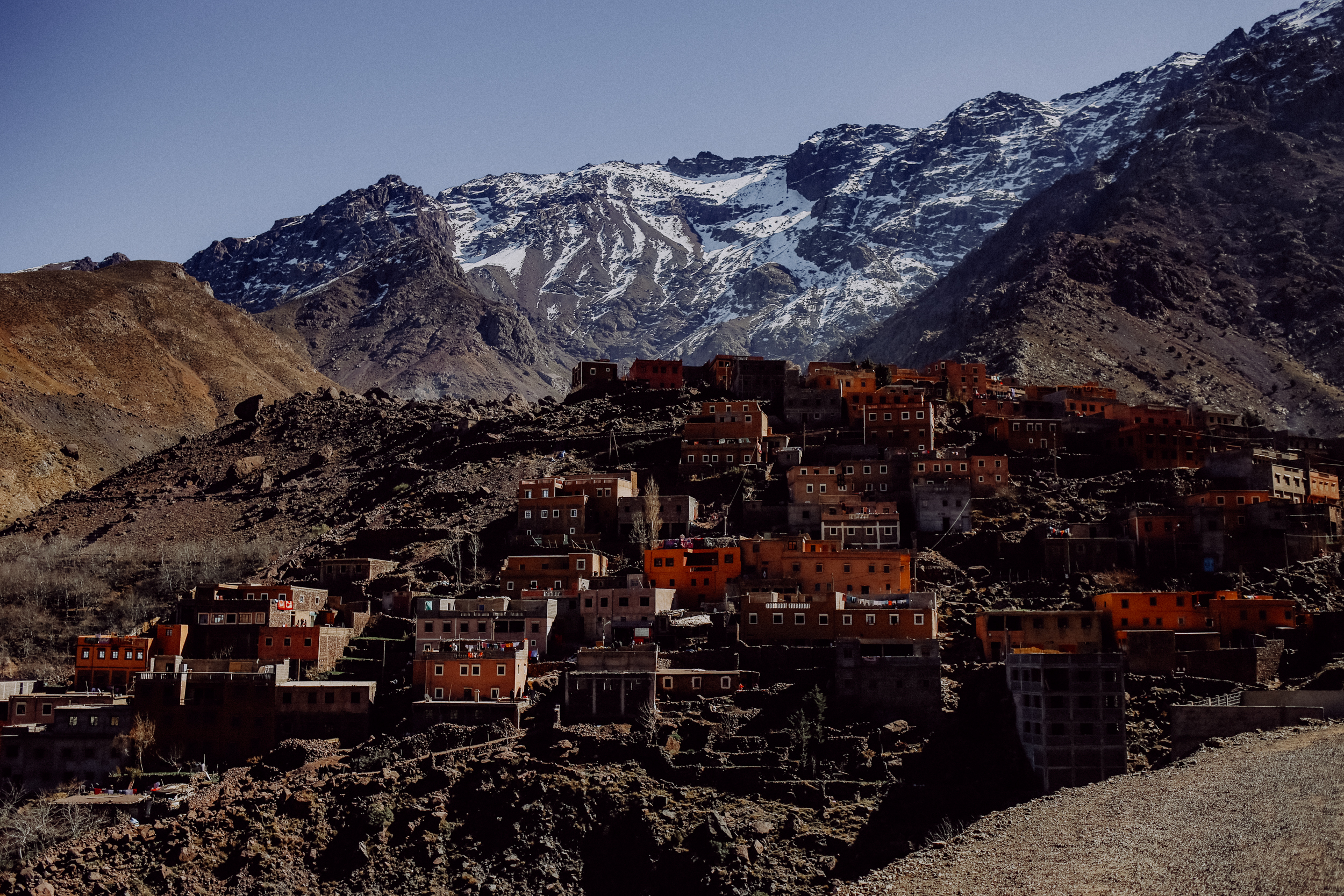 Imlil ist ein kleines Dörfchen, 70 Kilometer südlich von Marrakesch, gelegen im Zentrum des Hohen Atlas in der Region Marrakesch-Safi. Obwohl das Dorf eigentlich als wundervoller Ausgangspunkt für Trekking-Touren im Atlasgebirge bekannt ist, erhielt der Ort leider vor kurzem viel Aufmerksamkeit als Tatort eines Mordes an zwei jungen Skandinavierinnen. Diese Nachricht hat mich damals sehr aufgewühlt und betroffen gemacht und natürlich war ich auch ein wenig verunsichert, als ich das Dorf erreichte. Meine Bedenken zerstreuten sich jedoch nach kurzer Zeit, nicht zuletzt durch die Tatsache, dass die einzige Zufahrtsstraße seitdem Tag und Nacht von einer Touristenpolizei bewacht wird. Und auch die Menschen, die ich in Imlil traf, waren alle sehr nett und höflich, sodass ich mich schon nach der ersten Nacht sehr sicher fühlte.