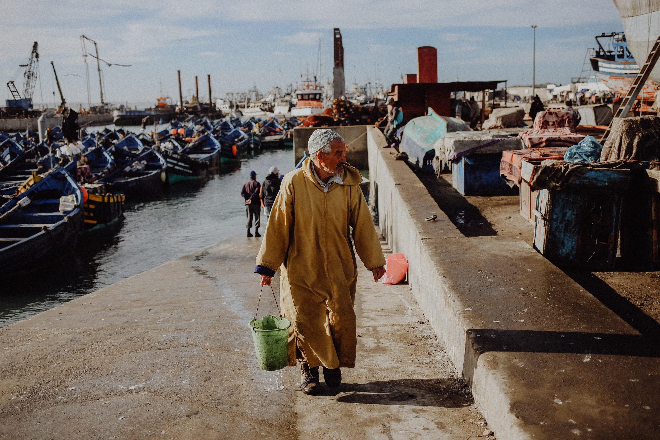 Bekannt ist Essaouira aber vor allem auch für seinen Hafen mit den vielen blauen Fischerbooten. Über ihm kreisen schreiend hunderte Möwen, begleitet vom Geräusch aufschlagender Wellen und warten darauf, dass die Fischer mit ihrem Fang an Land kommen. Entlang des Piers kann man (solang man sich nicht vor totem Fisch ekelt) sehr spannende Spaziergänge unternehmen und den Fischern dabei zusehen, wie sie Netze knüpfen, Boote reparieren, den Fang auf Verkaufstischen drapieren und um die besten Stücke handeln.