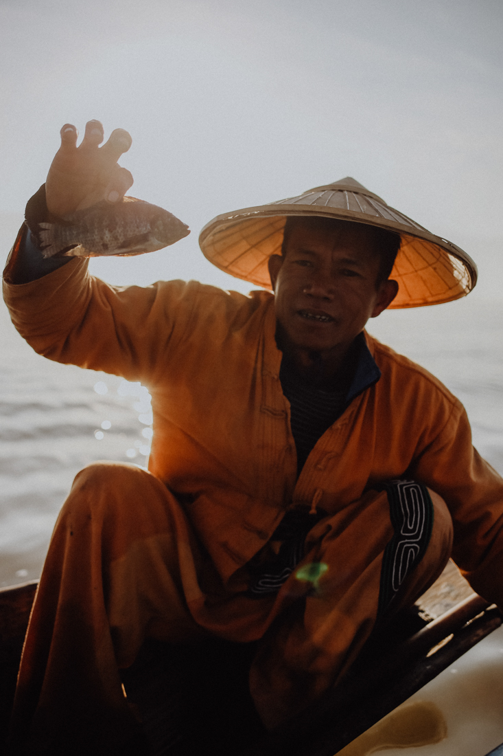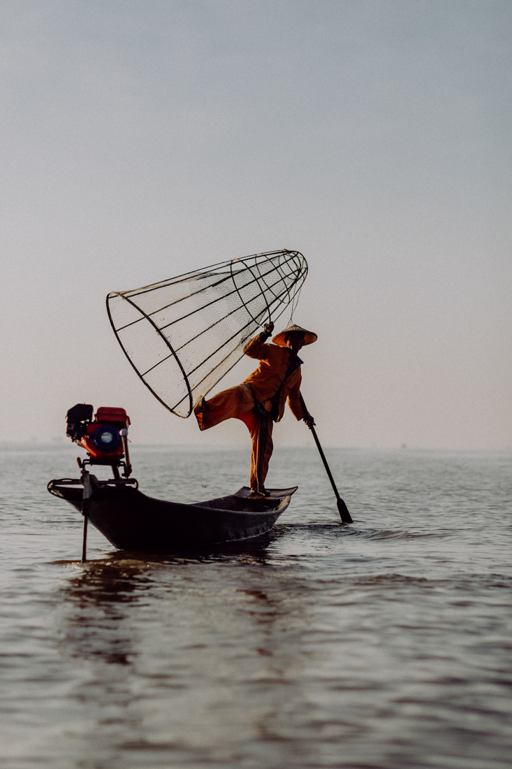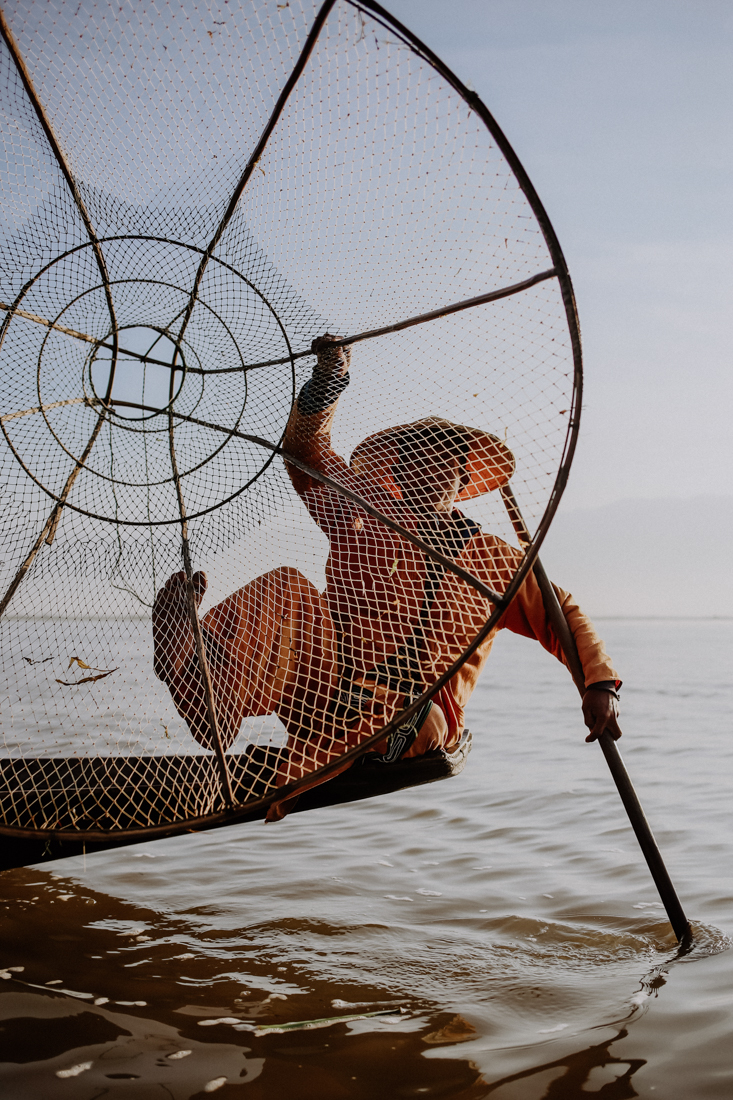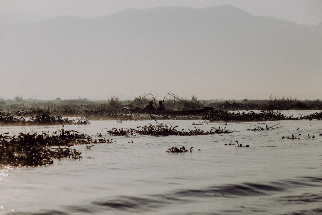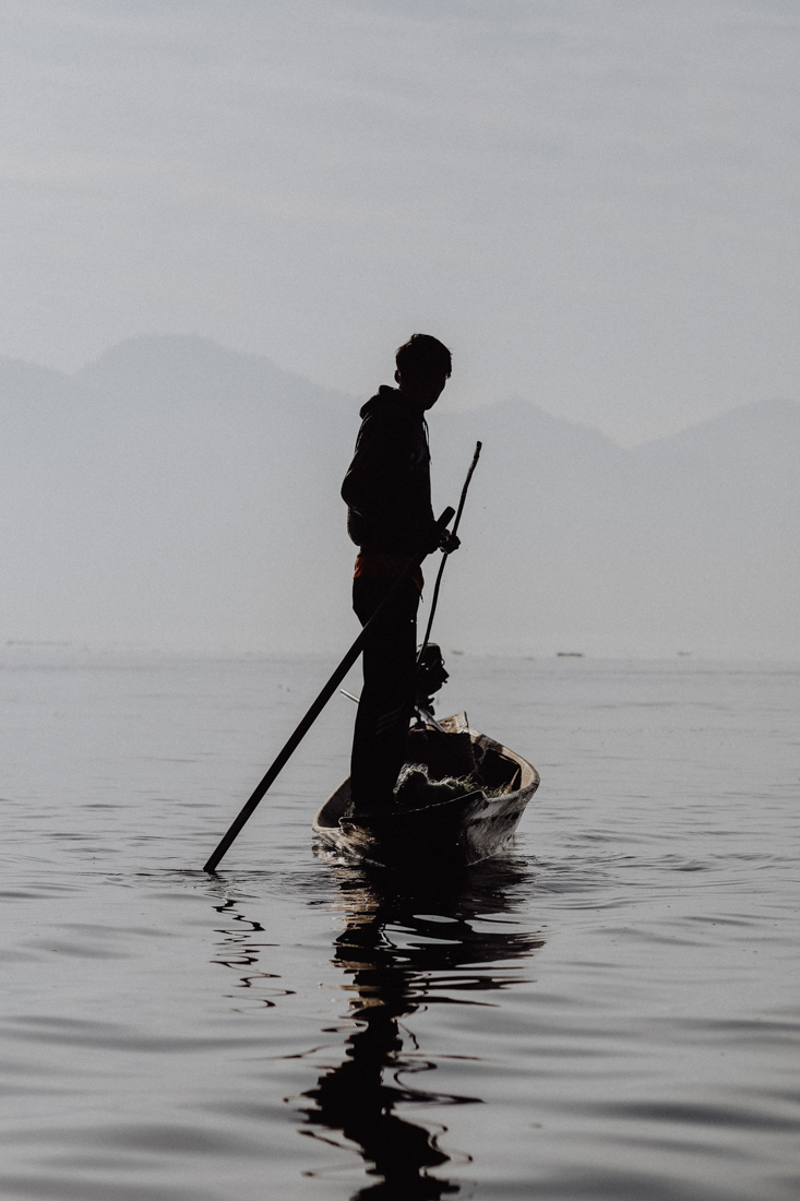 Das erste, was Du früh auf dem See entdecken wirst, sind mit Sicherheit die berühmten Intha-Fischer, die mit ihren kegelförmigen Netzen jeden zweiten Reiseführer zieren. Mit einer einmaligen Rudertechnik balancieren sie ihre Langheckboote einbeinig über das Wasser. Dabei stehen sie mit einem Bein auf einer kleinen Plattform am Ende ihres Bootes, während sie mit dem anderen das Ruder umschlingen und bewegen. So bleiben den Fischern zwei freie Arme für ihre Netze.