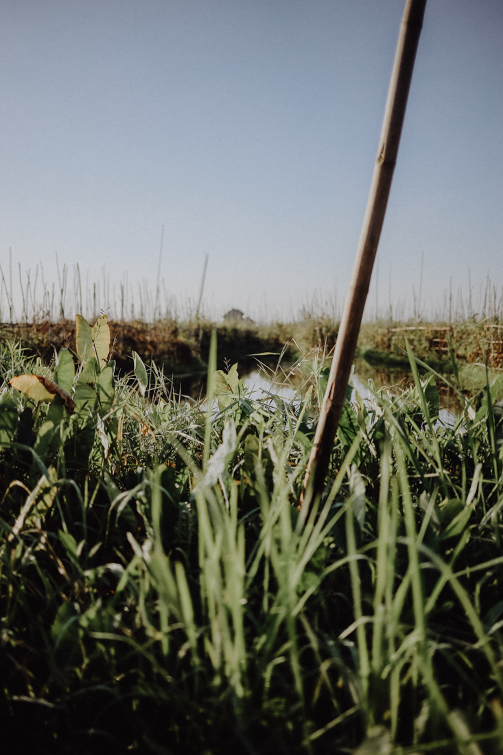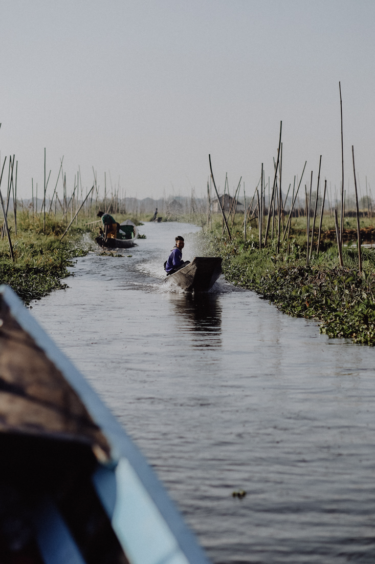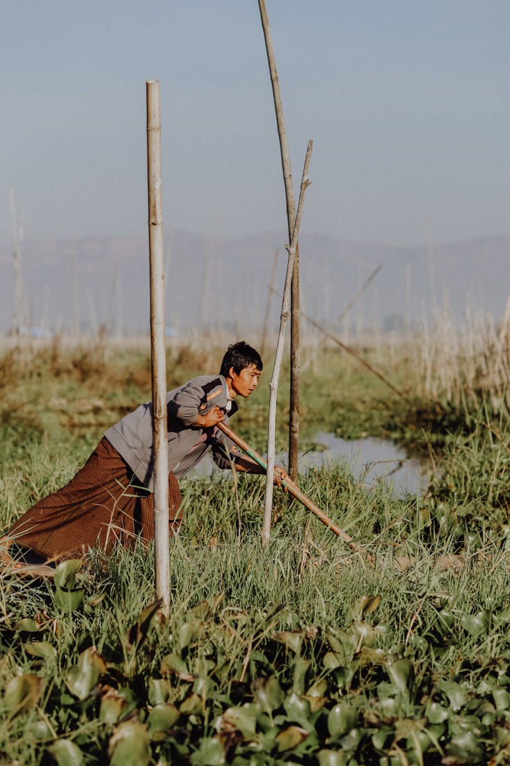 Auch in den schwimmenden Gärten scheint die Einbeinrudertechnik unerlässlich für die tägliche Arbeit. Nördlich von Nampan kultivieren die Intha Bauern hier nämlich riesige Gärten, in denen Blumen, Tomaten, Kürbisse und anderes Gemüse wachsen. Anstatt auf dem Boden wachsen die Pflanzen hier jedoch mitten im Wasser auf sogenannten Vegetationsmatten. Um sie zu pflegen, rudern die Bauern morgens und abends von Reihe zu Reihe und machen sich dabei besagte Rudertechnik zunutze, um beide Hände für die Pflege der Pflanzen frei zu haben.