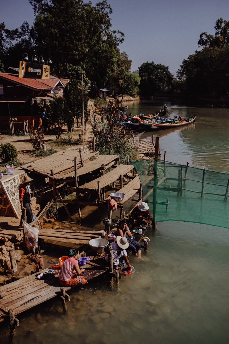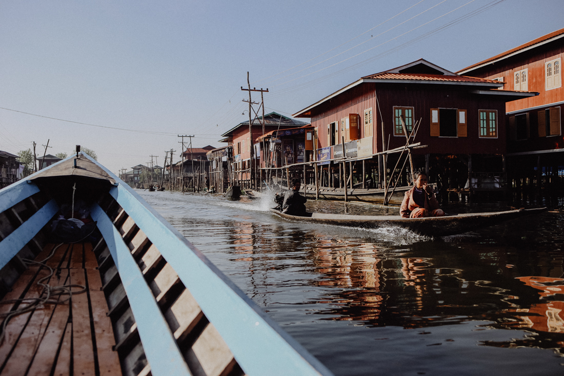 Unweit der schwimmenden Gärten erreichten wir schließlich auch die ersten Häuser. Obwohl mir das Prinzip längst auch Dokumentationen anderer Orte bekannt war, war es dennoch unglaublich spannend zu sehen, wie hier ganze Dörfer inklusive ihrer Tempel, Restaurants und Werkstätten mitten im Wasser errichtet wurden. Leider habe ich erst später von dem Ort Maing Thauk gelesen. Dieser Ort steht zur Hälfte im Wasser und auf Land und wird über eine 412 m lange Holzbrücke mit dem Ufer verbunden. Sicher wäre es kein Problem gewesen, den Ort zusätzlich zu besuchen.