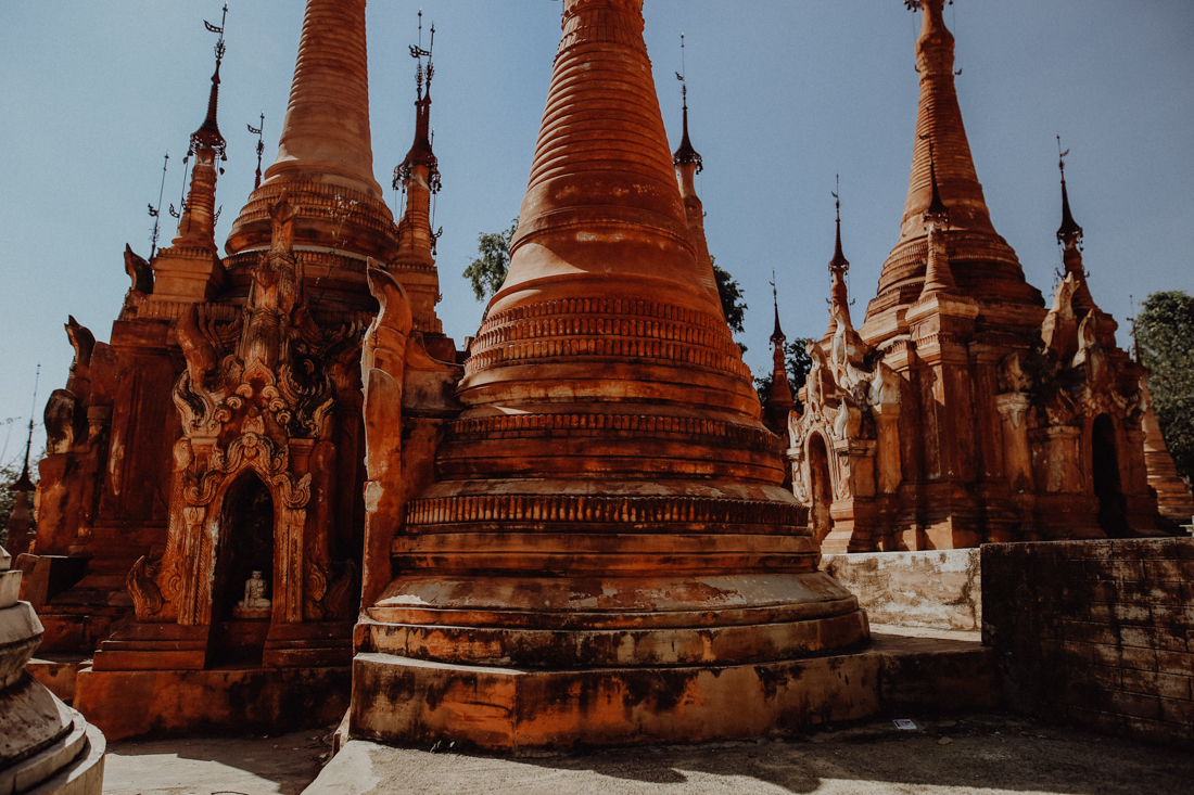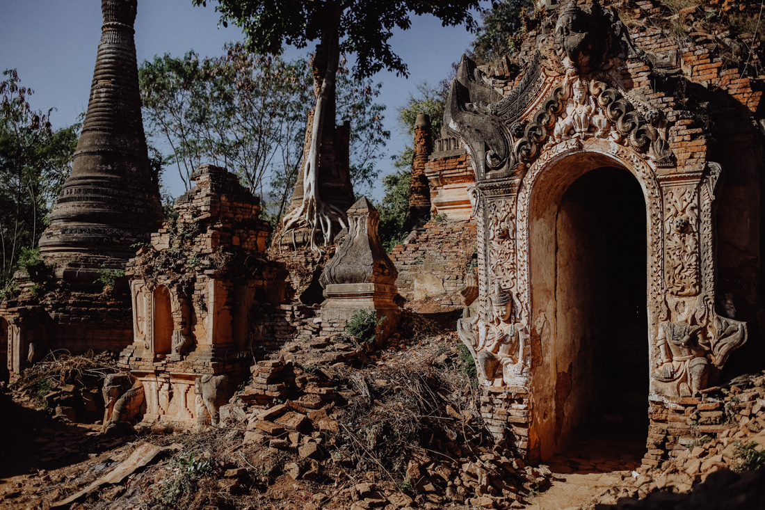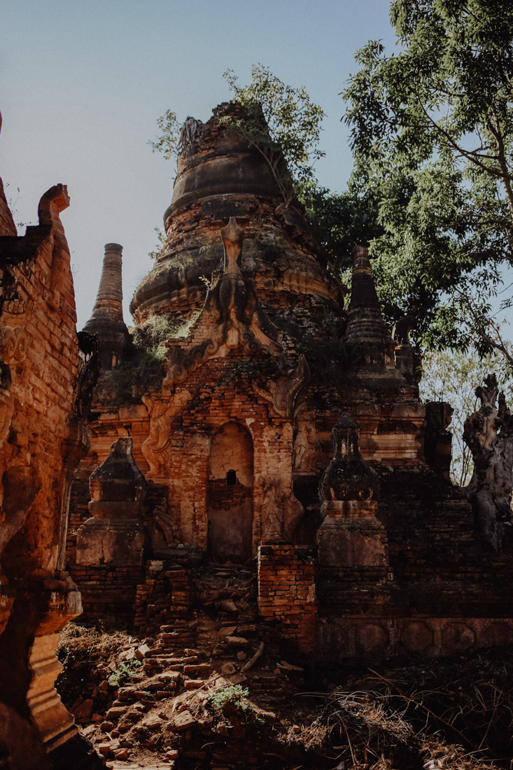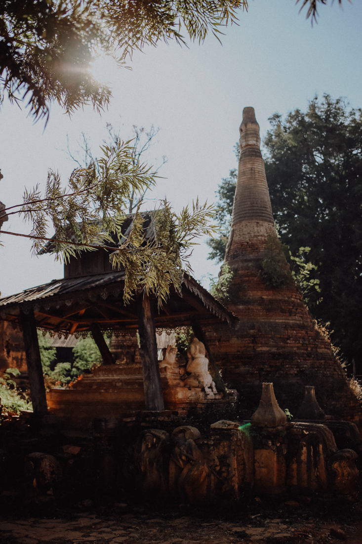 Absolutes Highlight der ganzen Tour war jedoch die Fahrt in das verwunschene Dorf Inthein. Über viele kleine Schleusen windet sich der Kanal unter einem dichten Blätterdach immer tiefer vom See in Land hinein, bis wir schließlich eine kleine Anlegestelle mit türkisblau funkelndem Wasser erreichten. Inthein ist vor allem für seine Shwe Inn Thein Pagode mit hunderten Stupas bekannt, die oberhalb einer langen Treppe auf einem Hügel liegt. Die erste Gruppe von Stupas befindet sich aber noch rechterhand am unteren Ende der Treppe und ist so zerfallen und von grün überwuchert, dass man glaubt, man würde sich in einer Indiana Jones Kulisse wiederfinden. Überall haben sich knochige Bäume einen Weg durch die alten Dächer gebahnt, grüne Schlingpflanzen haben Besitz von den Mauern ergriffen und hier und da lassen sich Überreste der einst detailreichen Reliefs von Buddhas, Tieren und Chinthe erkennen.