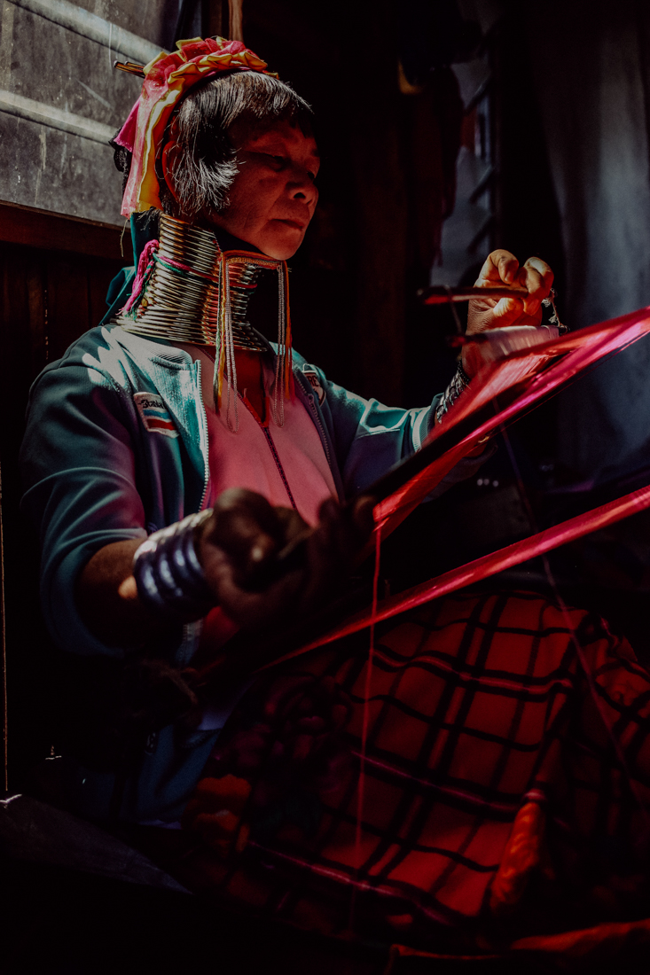 In den Werkstätten wirst Du unter Umständen auch auf die berühmten Padaung Frauen (besser bekannt als Long-Neck-Woman) treffen. Sie stellen eine der knapp 135 ethnischen Volksgruppen Myanmars und leben zumeist in den Bergen im Südosten des Landes. Sie sind deshalb unter allen ethnischen Gruppen besonders bekannt, weil sie goldene Ringe tragen, die im Laufe ihres Leben einen extrem langen Hals formen. Bereits mit 5 Jahren bekommen die Mädchen ihren ersten Ring um den Hals und auch unter die Knie. Ab dann werden in regelmäßigen Abständen neue Ringe hinzugefügt, bist die erwachsenen Frauen maximal 25 dieser Ringe um den Hals tragen. Die wiegen dann schon mal zwischen 6 und 10 Kilo! Entgegen aller Annahmen wird dabei jedoch nicht der Hals gedehnt, sondern Schultern, Schlüsselbeine und Rippen so verformt, dass es scheint, als hätten die Frauen einen extrem langen Hals. Je mehr Ringe eine Frau dabei trägt, desto höher ist ihr Ansehen in der Gesellschaft. (Wichtig: “Giraffenfrau” ist für die Padaung Frauen eine Beleidigung!)