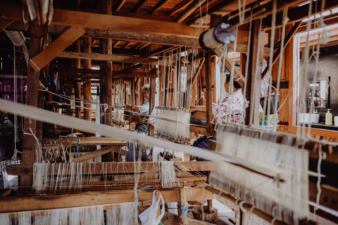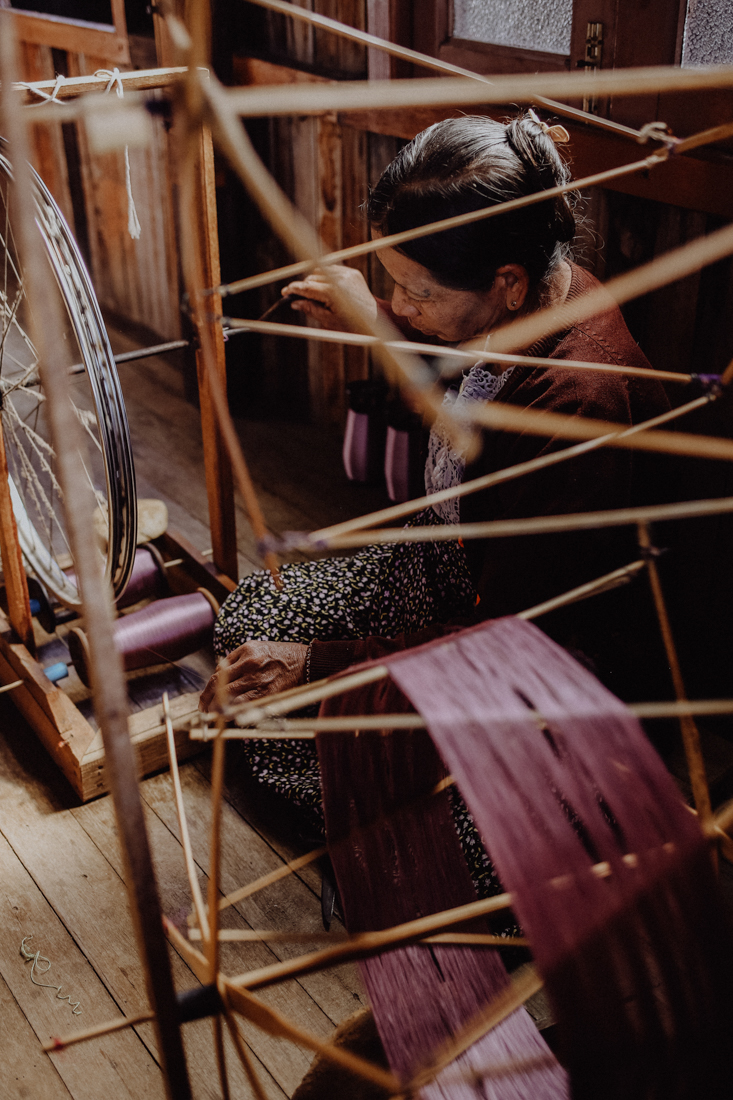 Innerhalb der Dörfer gibt es eine ganz ähnliche Infrastruktur wie an Land. Das bedeutet, dass es hier natürlich trotzdem jede Menge Werkstätten und Manufakturen gibt. Während unserer Tour haben wir einige besucht, darunter eine Silberschmiede, in der jede Menge wunderschöner Schmuck hergestellt wird, eine Weberei und eine Zigarrenfabrik. Ganz besonders spannend war dabei für uns die Lotusspinnerei, da der Inle See tatsächlich weltweit der einzige Ort ist, an dem aus Lotus Seide gesponnen wird. Dabei werden in einem aufwändigen Verfahren aus dem Stängel der Lotuspflanze einzelne, feine Fäden gewonnen, die dann erst per Hand verzwirnt und später auf einer Spule zu Garn gesponnen werden. Auf diese Weise entsteht ein wirklich einzigartiges, hochwertiges Naturprodukt, das sieben Mal teurer ist als herkömmliche Seide.