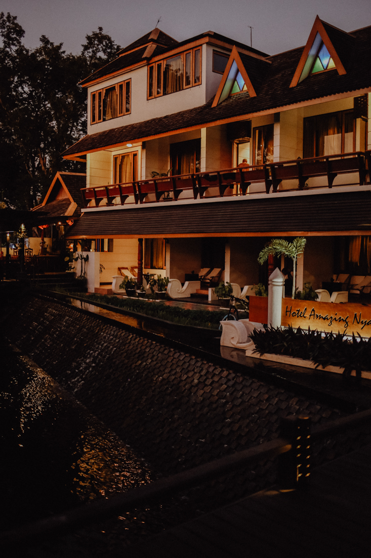 Wenn Du zum Inle See möchtest, hast Du entweder die Möglichkeit in Nyaung Shwe, einem kleinen Ort am nördlichen Ende des Sees, oder in einem der Ressorts weiter südlich direkt am Wasser zu übernachten. Uns gefiel die Vorstellung in Nyaung Shwe zu bleiben, da wir dort zu Fuß in die nahgelegenen Restaurants schlendern konnten, ohne erst noch einmal mit Roller, Fahrrad oder Tuktuk fahren zu müssen. Die Aussage des Lonely Planet, Nyaung Shwe sei heruntergekommen, können wir nicht teilen. Sicher ist der kleine Ort kein Vergleich zu den großen Städten, trotzdem machen die vielen Restaurants und Bars den kleinen Ort sehr beschaulich. Noch dazu hatten wir uns für ein wirklich hübsches Hotel entschieden: