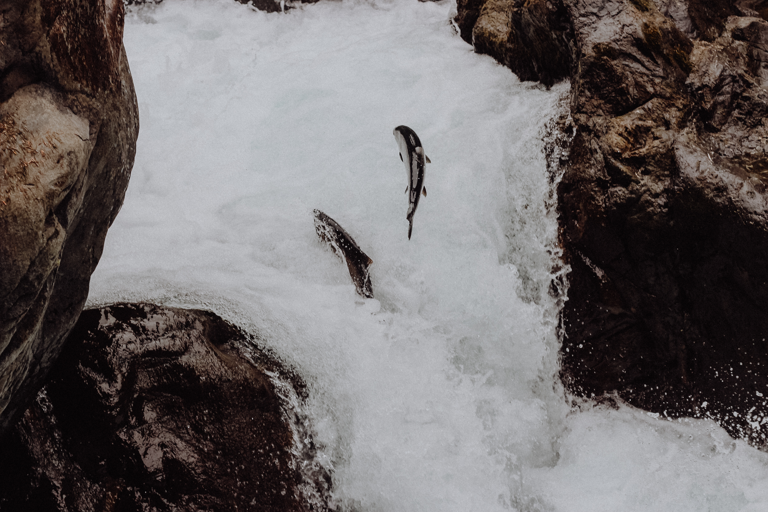 Nach dem Spaziergang zu den Marymere Falls setze ich meine Tour fort. Ich will entlang des Sol Duc Rivers zu den Sol Duc Hot Springs fahren, um mich aufzuwärmen. Immer wieder halte ich an den Flussbiegungen an, mache Fotos und genießen für ein paar Minuten die frische Luft. Gerade, als ich mich auf die Felsen des Flussufers gesetzt habe, sprang direkt vor meiner Nase ein Lachs aus dem Wasser. Anscheinend hatte ich zufällig eine echte Salmon Cascade gefunden. Wie ich später las, ist der Sol Duc River bekannt dafür, dass hier im Herbst die Lachse in ihre Laichgebiete wandern. Und tatsächlich sprangen unzählige Fische mit beeindruckender Ausdauer flussaufwärts von Stein zu Stein, sodass ich genügend Versuche hatte, um sie im richtigen Moment zu fotografieren.