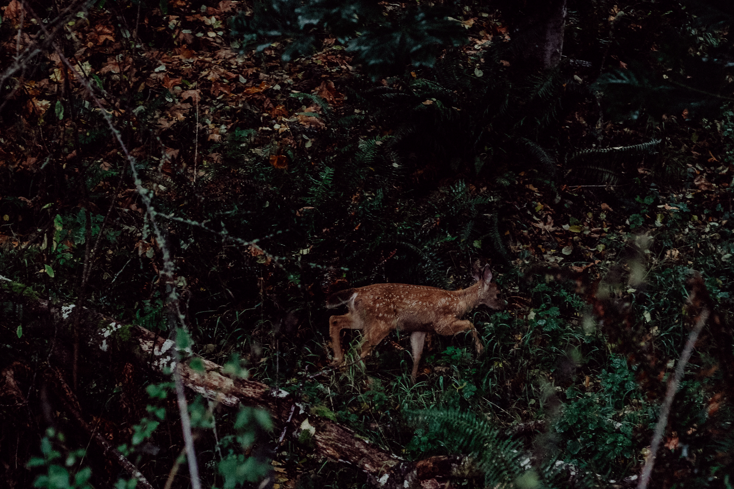 Nachdem ich eine halbe Ewigkeit an den Salmon Cascades zugebracht hatte, fuhr ich – nun wirklich durchfroren – in die Sol Duc Hot Springs, um mich aufzuwärmen, bevor ich auch die kommende Nacht wieder bei Kälte und Regen im Auto verbringen würde. Der Himmel zog sich gerade zu, als ich die Küste nördlich des Lake Crescent erreichte und dichter Regen fiel über dem Wald. Deshalb verbrachte ich auch die letzten Stunden vor dem Schlafen mit heißem Tee im Auto und beobachtete noch lang durch den offenen Kofferraum, wie der Regen den Wald in ein dunkles, glänzendes grün färbte. Und als wäre dieser Tag noch nicht aufregend genug gewesen kamen gerade, als ich mich beschweren wollte, dass ich doch viel lieber an einem Lagerfeuer sitzen würde, ein Reh mit seinen beiden Rehkitzen durch das Dickicht, um mir gute Nacht zu sagen.